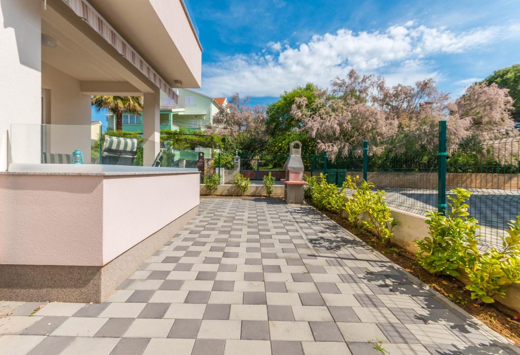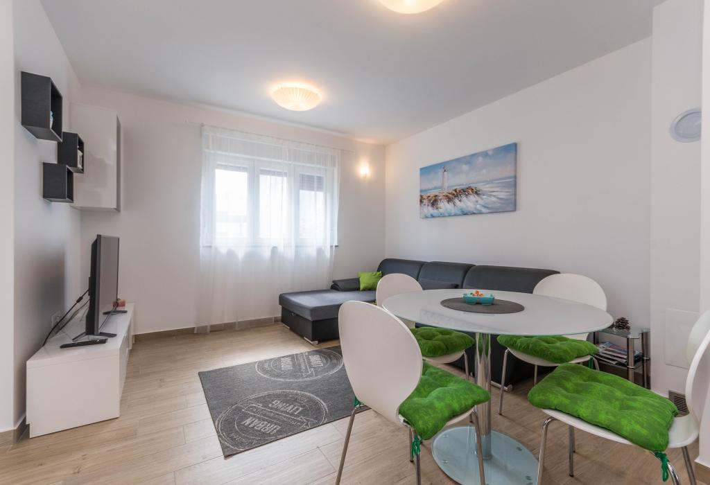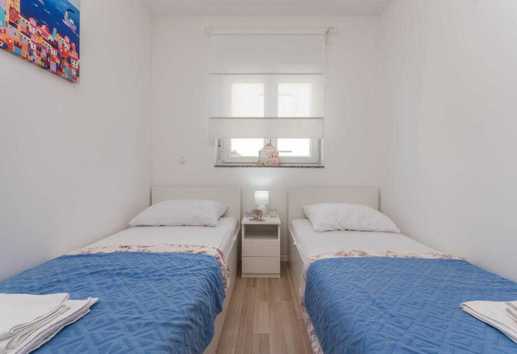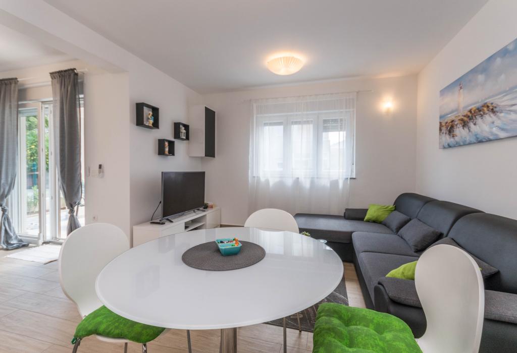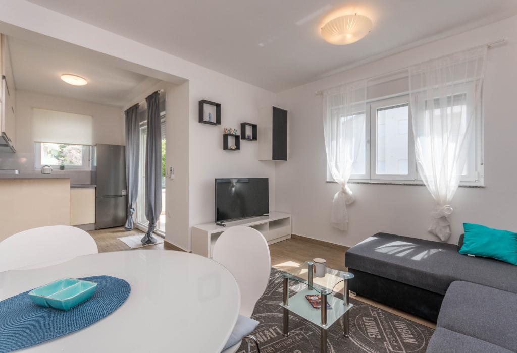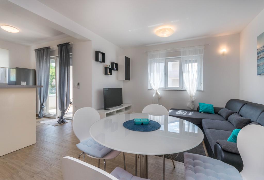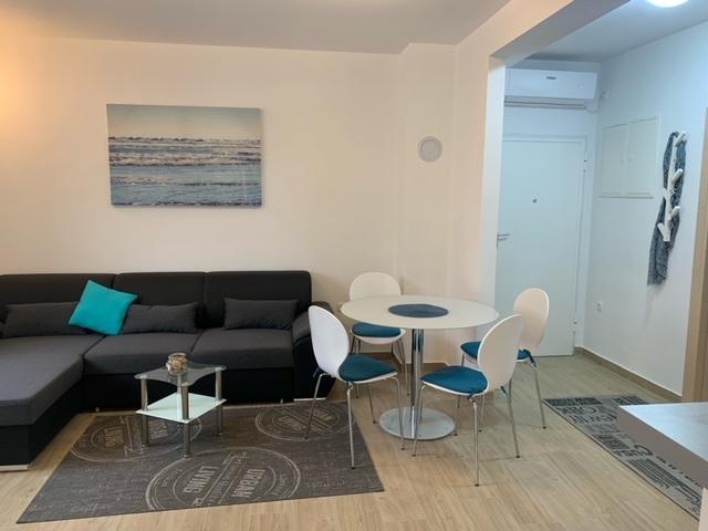Le bâtiment a été construit comme une maison de 6 appartements qui ont été construits à dessein comme des unités individuelles (appartements), avec une entrée séparée, à l'intérieur d'un escalier commun. L'appartement Turquoise 1 convient aux familles avec enfants car sur 58 m2 il propose 2 chambres, une cuisine confortable avec un séjour ouvert. La cuisine comprend un lave-vaisselle, un four micro-ondes, une cafetière, un grand réfrigérateur avec congélateur, une cuisinière électrique avec four et une plaque vitrocéramique. Le salon dispose d'une télévision 52 ", WIFI gratuit. A côté du salon il y a une grande terrasse et cour avec barbecue. La salle de bain offre une machine à laver, un sèche-cheveux, des serviettes et des produits d'hygiène de base. L'appartement est situé à 50m du plage avec de petites pierres et la côte, à 100 m du centre-ville et d'autres installations.L'appartement 2 est situé au 1er étage de l'immeuble et n'a pas le droit d'utiliser la cour.A l'intérieur de la salle de bain il n'y a pas de machine à laver.