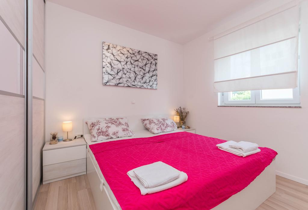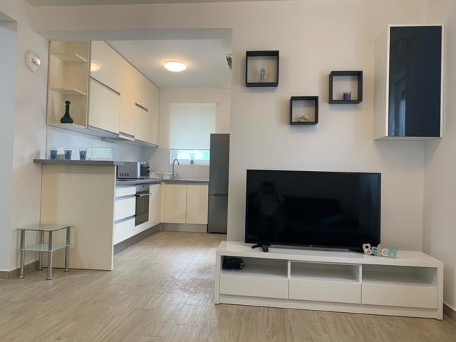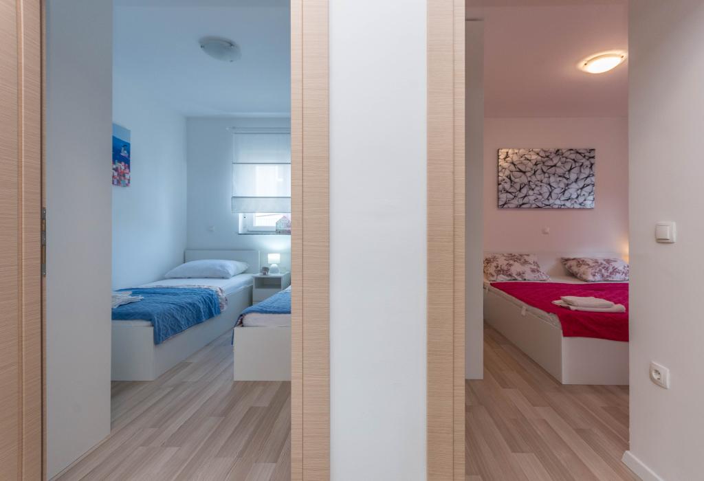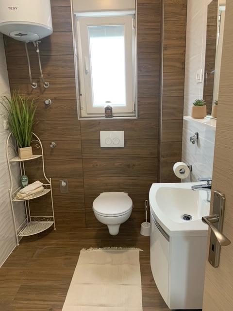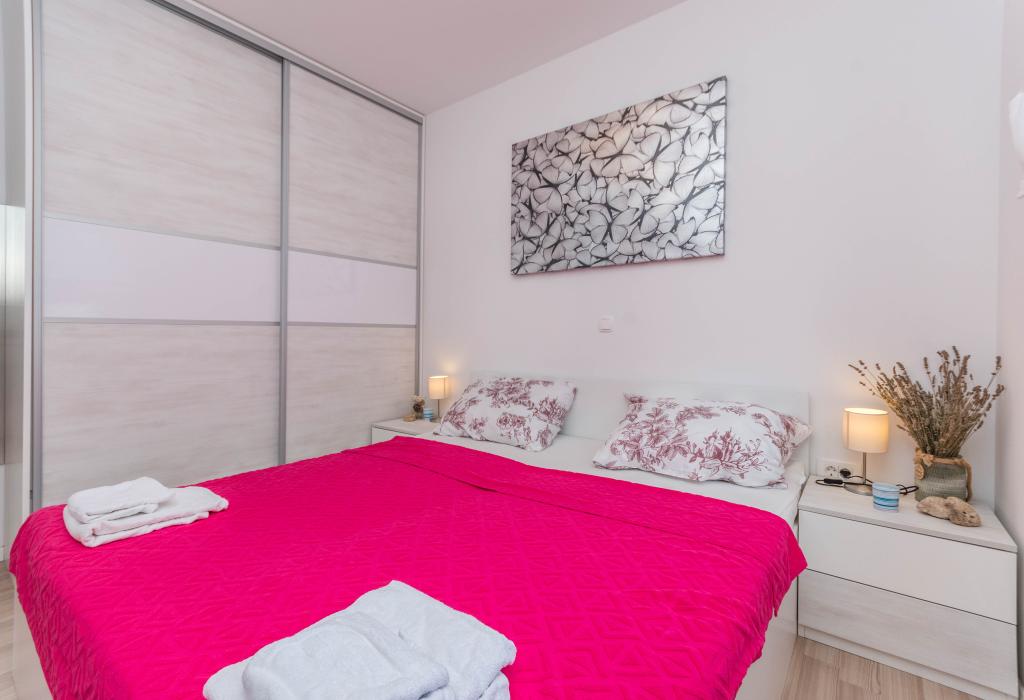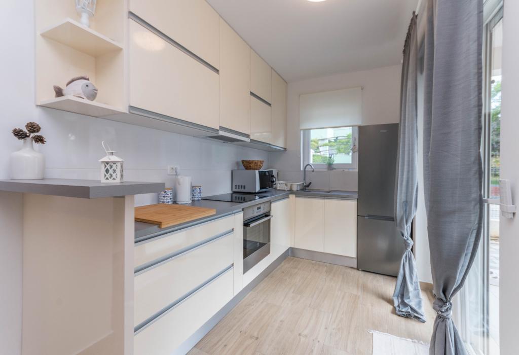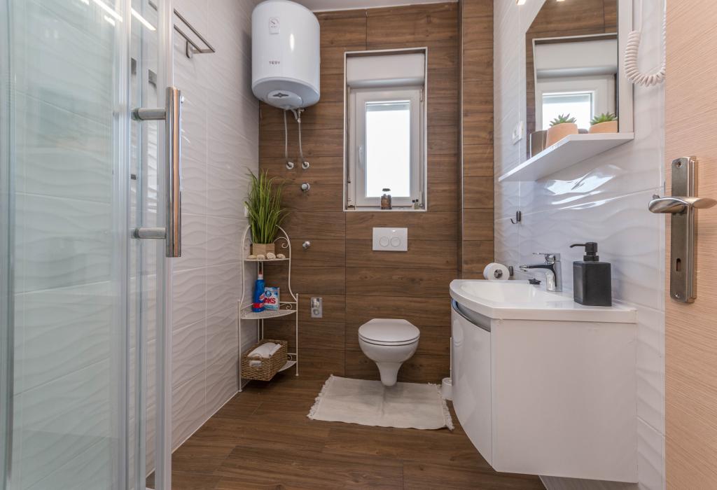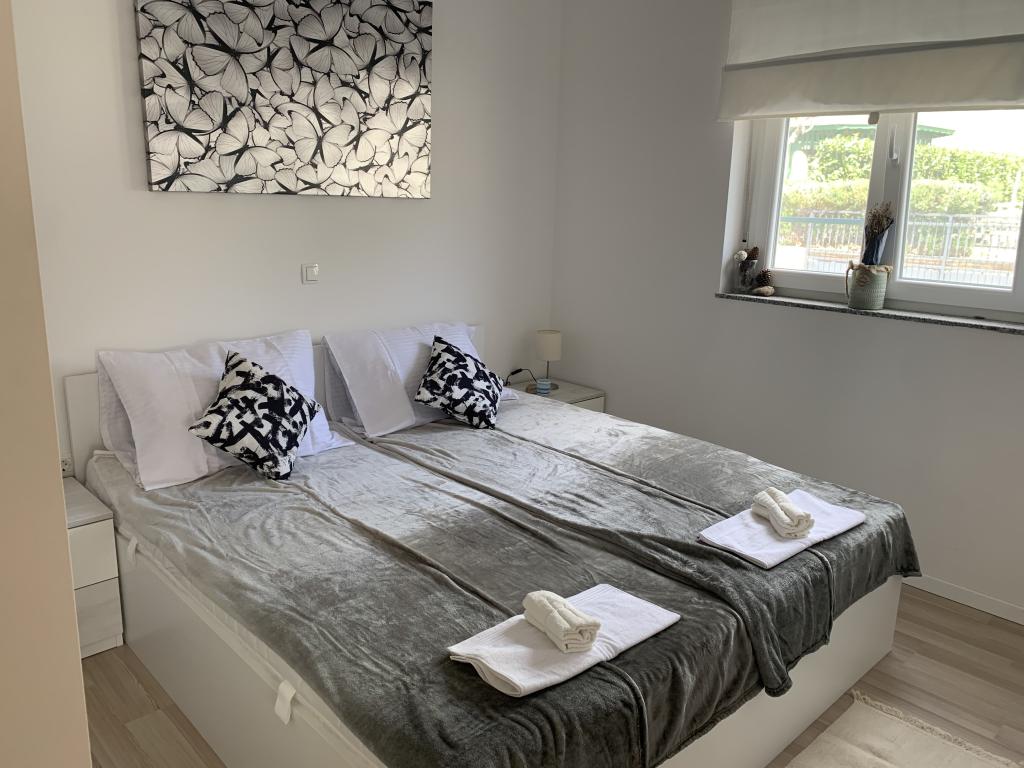 Le bâtiment a été construit comme une maison de 6 appartements qui ont été construits à dessein comme des unités individuelles (appartements), avec une entrée séparée, à l'intérieur d'un escalier commun. L'appartement Turquoise 1 convient aux familles avec enfants car sur 58 m2 il propose 2 chambres, une cuisine confortable avec un séjour ouvert. La cuisine comprend un lave-vaisselle, un four micro-ondes, une cafetière, un grand réfrigérateur avec congélateur, une cuisinière électrique avec four et une plaque vitrocéramique. Le salon dispose d'une télévision 52 ", WIFI gratuit. A côté du salon il y a une grande terrasse et cour avec barbecue. La salle de bain offre une machine à laver, un sèche-cheveux, des serviettes et des produits d'hygiène de base. L'appartement est situé à 50m du plage avec de petites pierres et la côte, à 100 m du centre-ville et d'autres installations.L'appartement 2 est situé au 1er étage de l'immeuble et n'a pas le droit d'utiliser la cour.A l'intérieur de la salle de bain il n'y a pas de machine à laver.