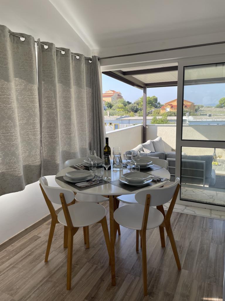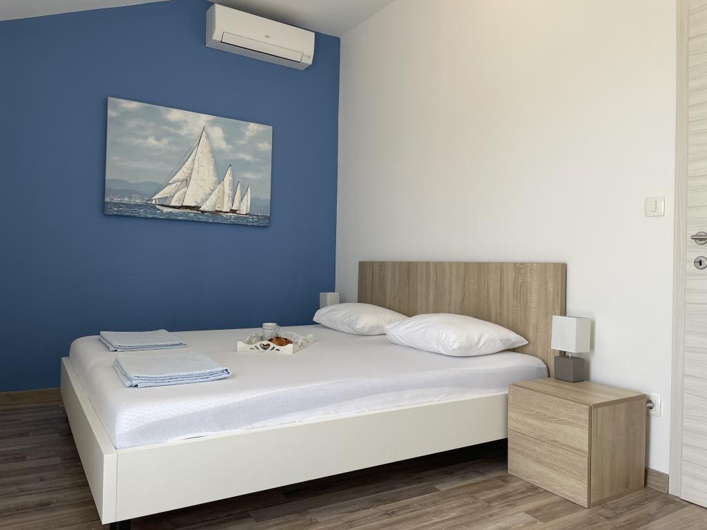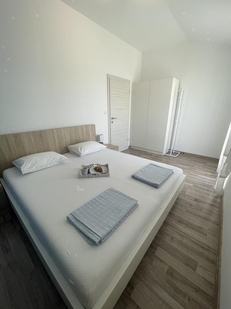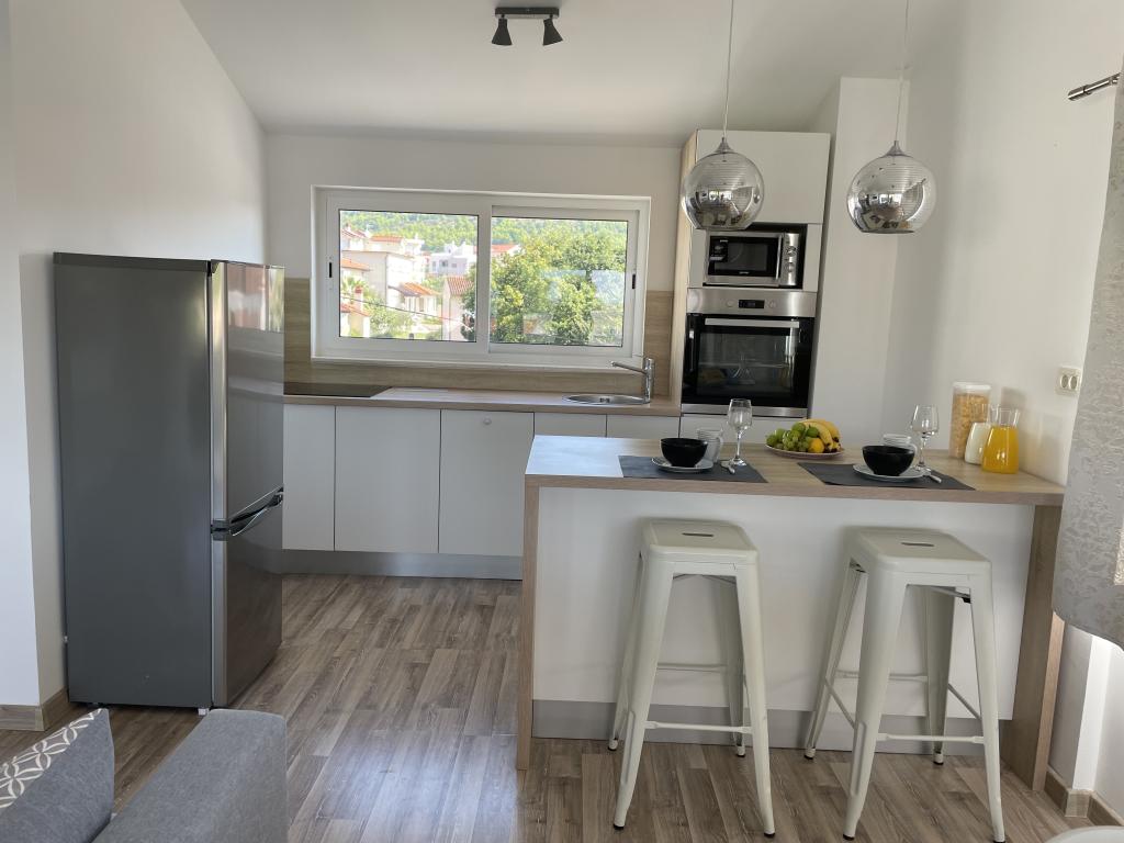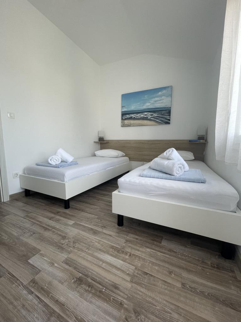 Appartements modernes et entièrement équipés, situés dans un quartier calme, à seulement 300 m de la plage et de ses nombreux commerces et services. Situés au deuxième étage d'une maison familiale, ces appartements donnent sur une cour clôturée avec terrasse couverte, cuisine d'été et barbecue. Un parking privé se trouve devant la maison. Un arrêt de bus est à 50 m et le premier magasin à 200 m. Le centre-ville est à 800 m, accessible par la route ou par la promenade du bord de mer. Nous aimons les animaux, mais les animaux de compagnie ne sont pas admis.