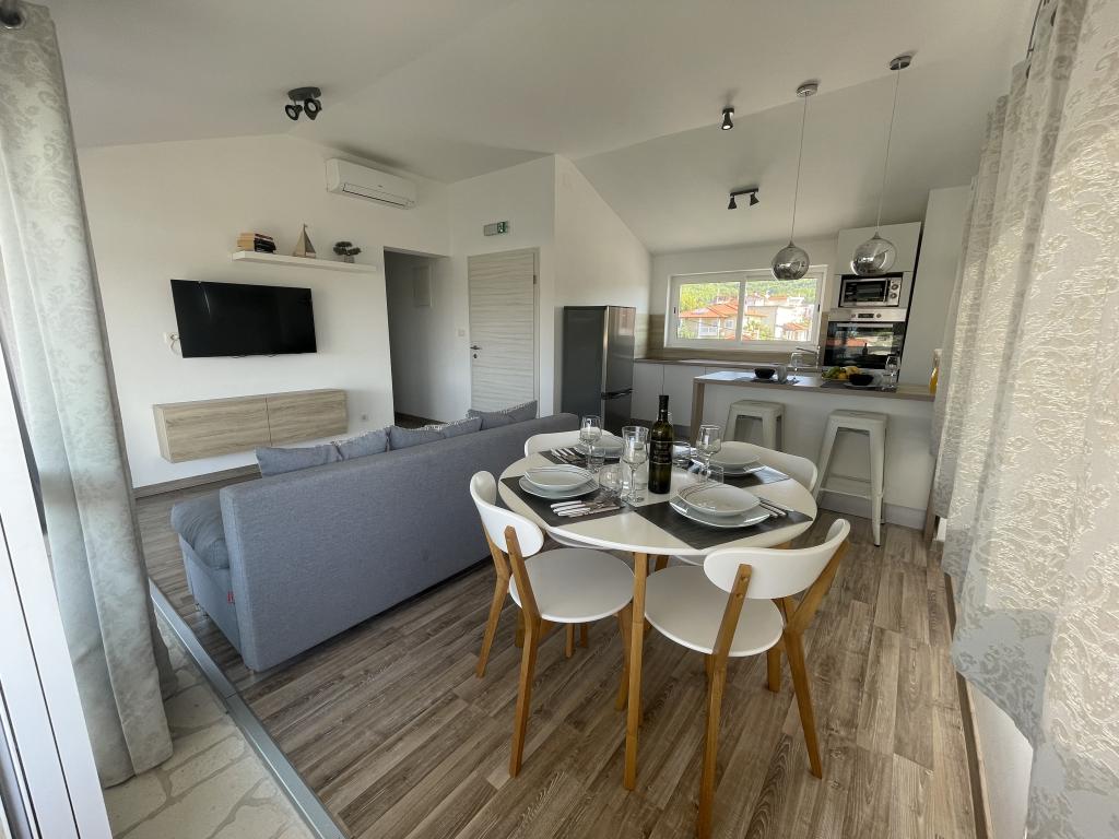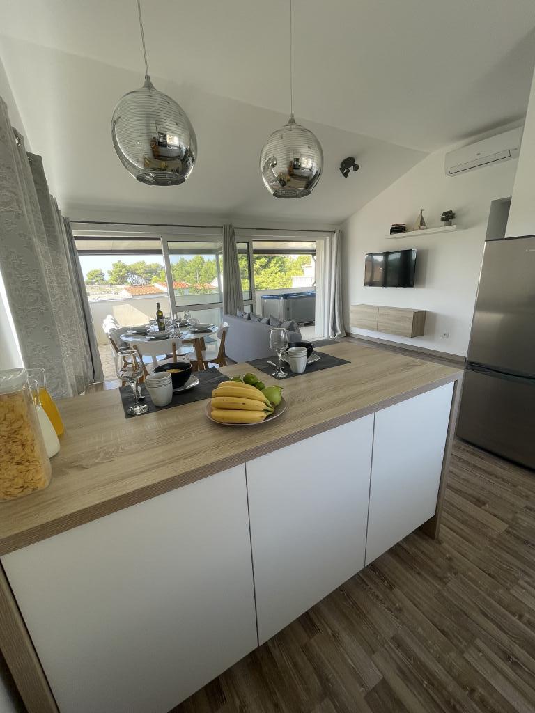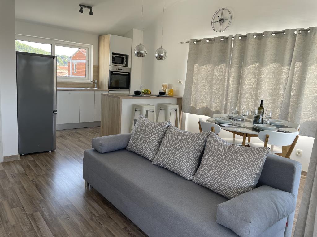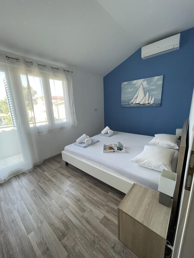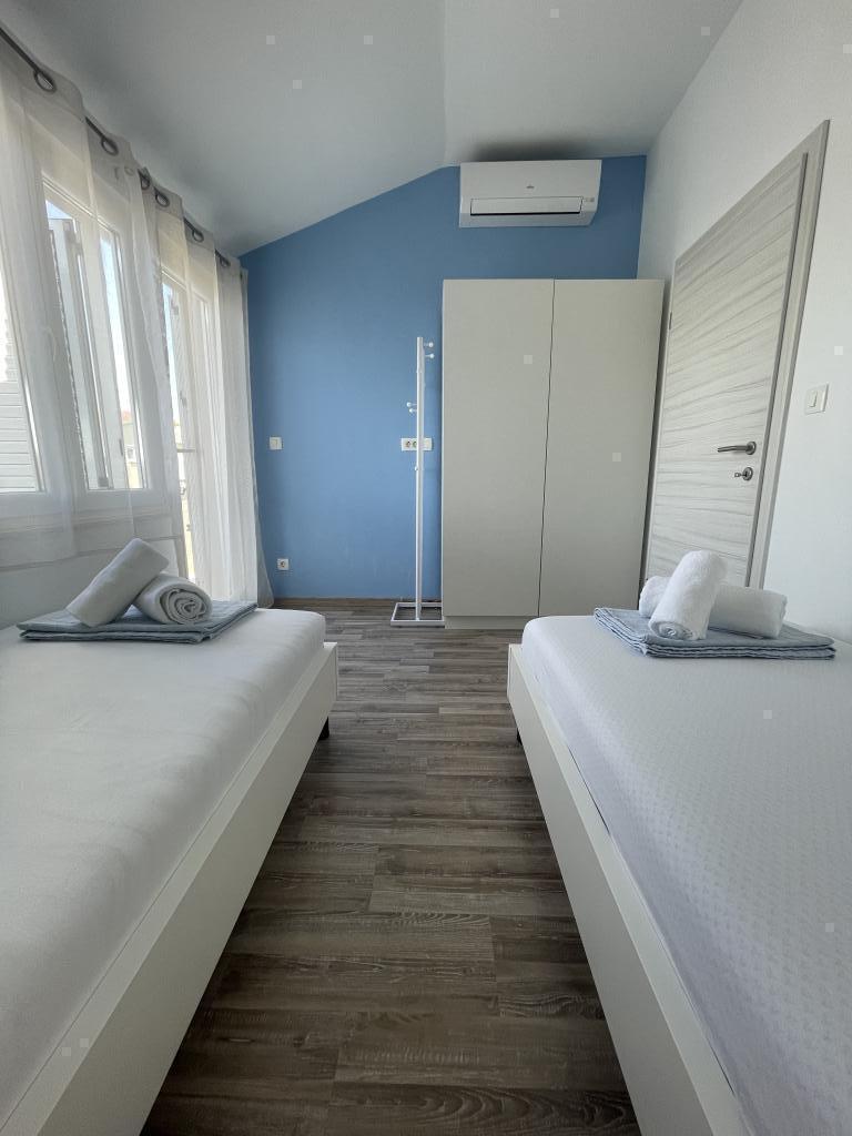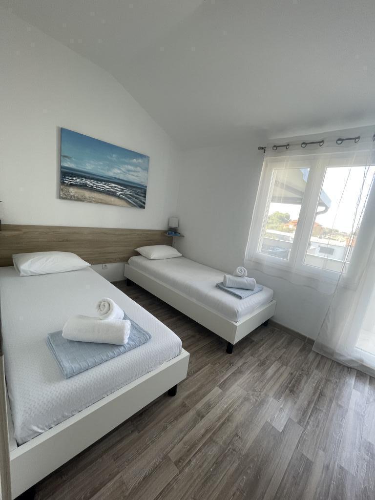 Appartements modernes et entièrement équipés, situés dans un quartier calme, à seulement 300 m de la plage et de ses nombreux commerces et services. Situés au deuxième étage d'une maison familiale, ces appartements donnent sur une cour clôturée avec terrasse couverte, cuisine d'été et barbecue. Un parking privé se trouve devant la maison. Un arrêt de bus est à 50 m et le premier magasin à 200 m. Le centre-ville est à 800 m, accessible par la route ou par la promenade du bord de mer. Nous aimons les animaux, mais les animaux de compagnie ne sont pas admis.