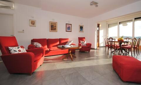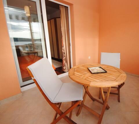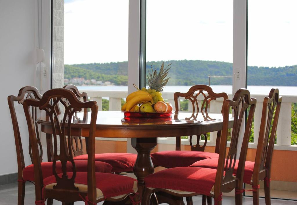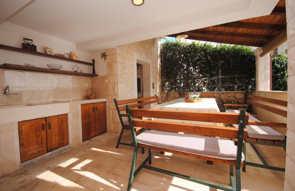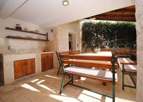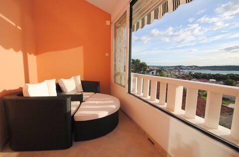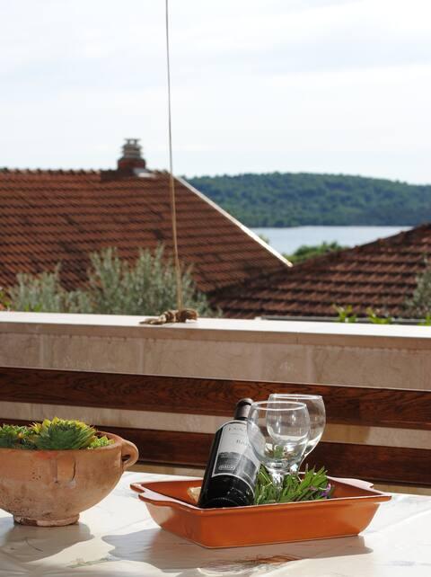 L'appartement de luxe avec terrasse "Lucy" et vue sur la mer est situé sur l'île de Ciovo dans un quartier calme à seulement 10 minutes de la vieille ville historique de Trogir. L'appartement est situé au 1er étage d'une maison familiale. Cet appartement de trois pièces avec une belle vue sur la mer est meublé selon les normes les plus élevées et équipé de tout le nécessaire pour passer un agréable séjour. Salon : Le salon spacieux est équipé d'une Smart TV, d'un accès Internet sans fil, de canapés et fauteuils confortables et d'une grande et belle terrasse. Chambres : Il y a des escaliers menant à 3 chambres luxueuses (chambre Soleil (en suite avec terrasse), chambre Mer et chambre Sable (avec terrasse et salle de bain commune)). Chaque chambre dispose de la climatisation, de tables de chevet, d'une armoire avec draps et serviettes et d'un lit double (1,60 × 2). Derrière la maison se trouve une belle cuisine d'été vintage (avec coin barbecue) équipée de tout ce dont vous avez besoin pour profiter du style méditerranéen.