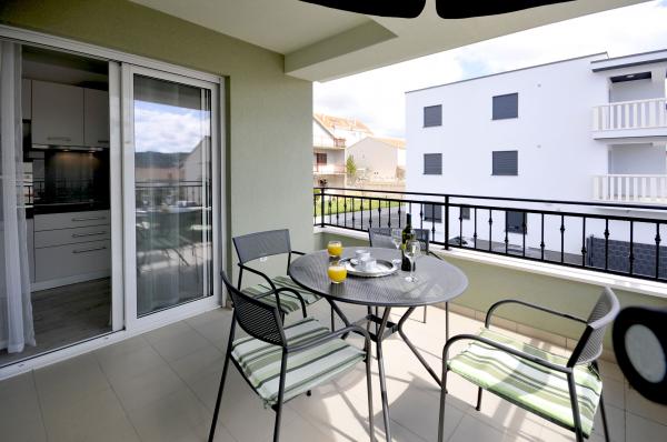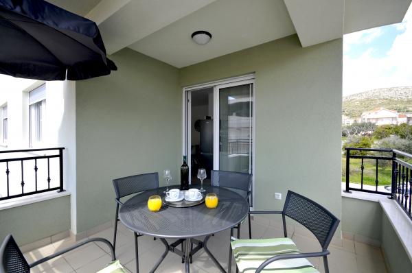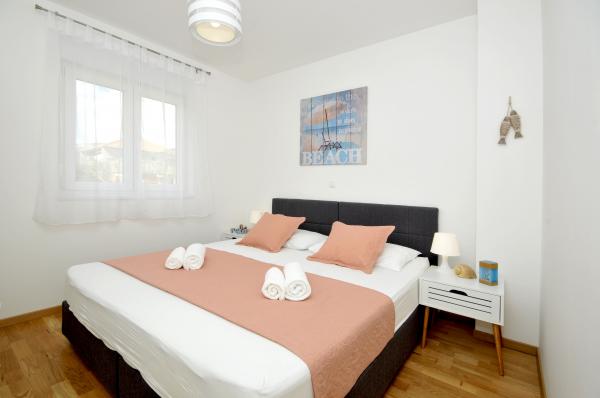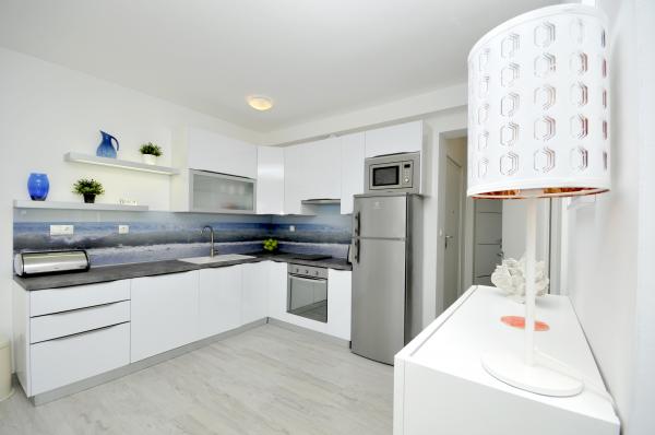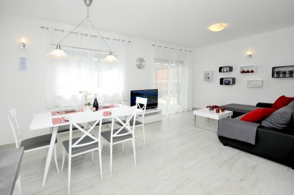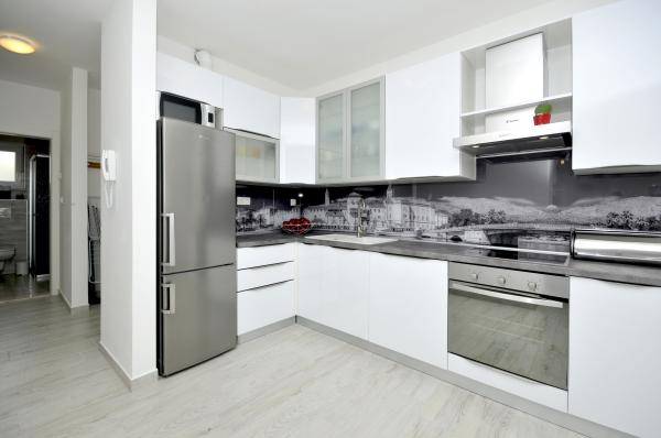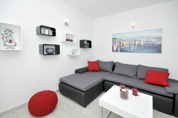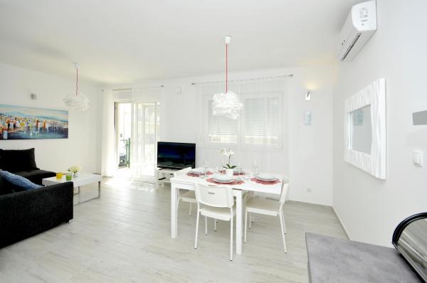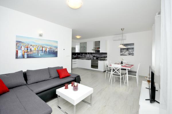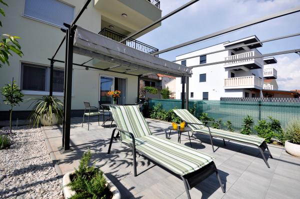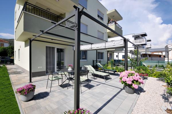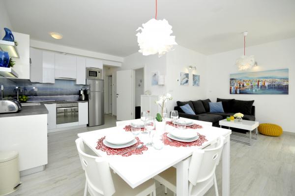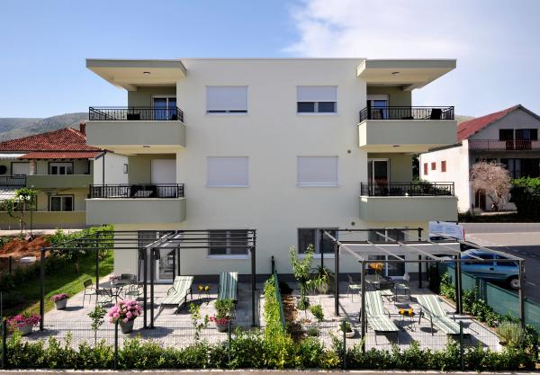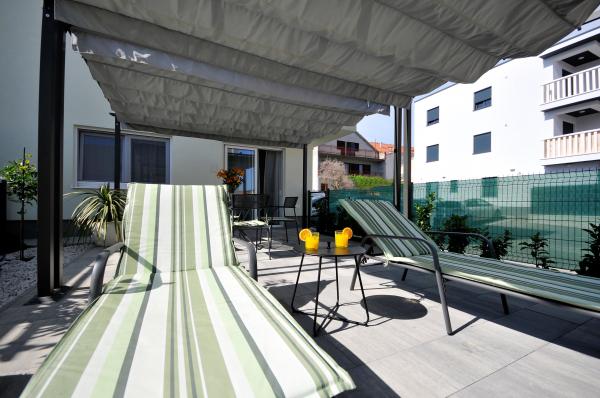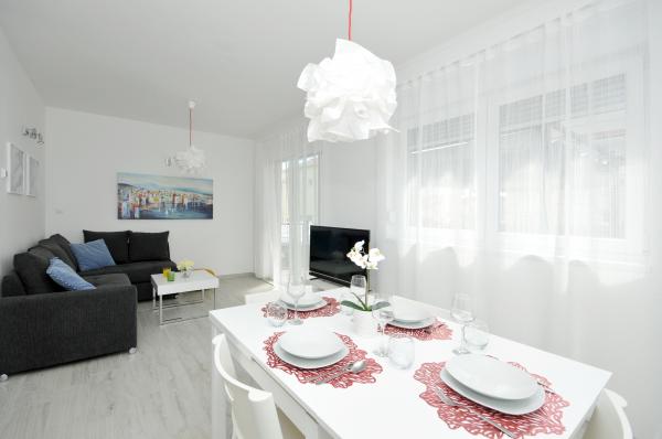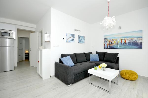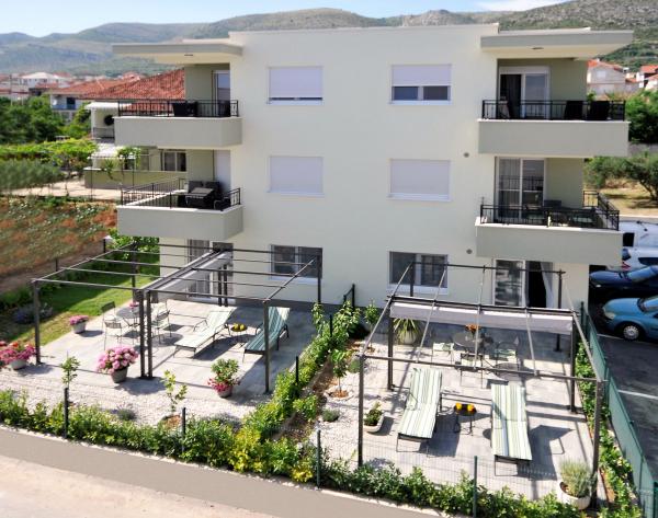Les appartements Town Trogir bénéficient d'un emplacement privilégié sur la partie continentale de Trogir, à seulement 400 m du centre historique et à 900 m de la plage de la ville nouvelle. Cette dernière est accessible par une promenade en bord de mer. Toutes les commodités principales sont accessibles à pied en 5 à 10 minutes. Les appartements Town Trogir sont récents et situés dans un petit immeuble résidentiel de 6 appartements. D'une superficie de 50 à 60 m², ils se trouvent au rez-de-chaussée. Décorés avec goût et entièrement équipés, ils comprennent 2 chambres, un séjour avec coin repas, une cuisine entièrement équipée, une salle de bains et une grande terrasse meublée. Un parking gratuit est disponible devant l'immeuble. Le linge de lit et les serviettes sont fournis. Le Wi-Fi est gratuit. La taxe de séjour est incluse.