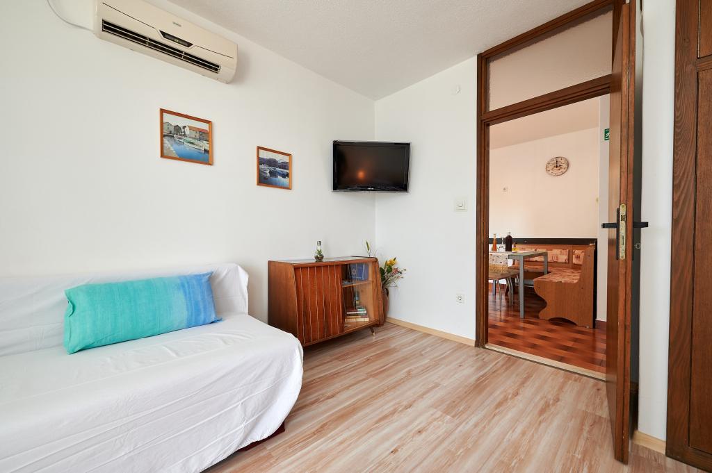 Les appartements sont situés sur l'île de Ciovo à 300 mètres de la vieille ville et à 50 mètres de la plage. Les appartements sont entièrement meublés et climatisés, avec sa propre entrée, un balcon privé avec vue sur la mer et un parking. Le rez de chaussée appartement A2 +1 (avec une chambre), qui a une capacité maximale de 3 personnes, et au premier étage d'un appartement A4 (deux chambres), qui a une capacité de jusqu'à 4 personnes. Il ya une possibilité de louer deux appartements pour un maximum de 7 personnes. Climatisation et taxe de séjour sont inclus.