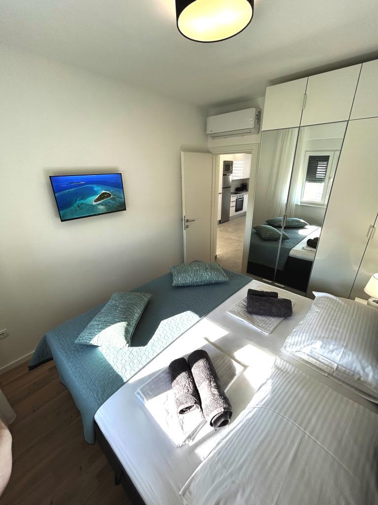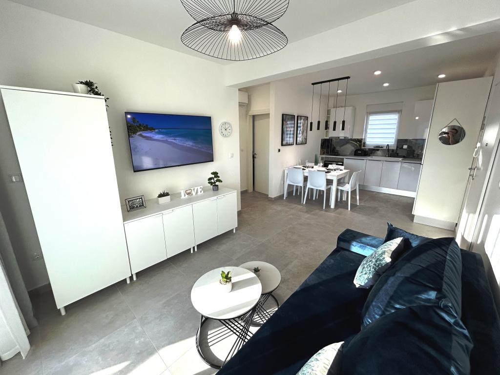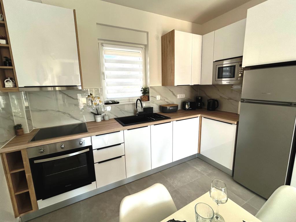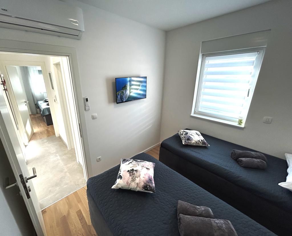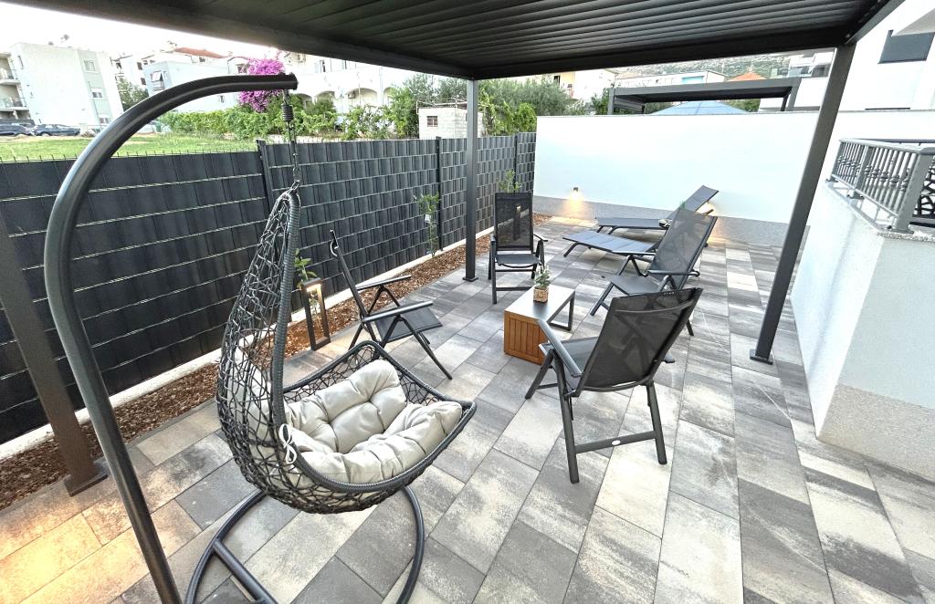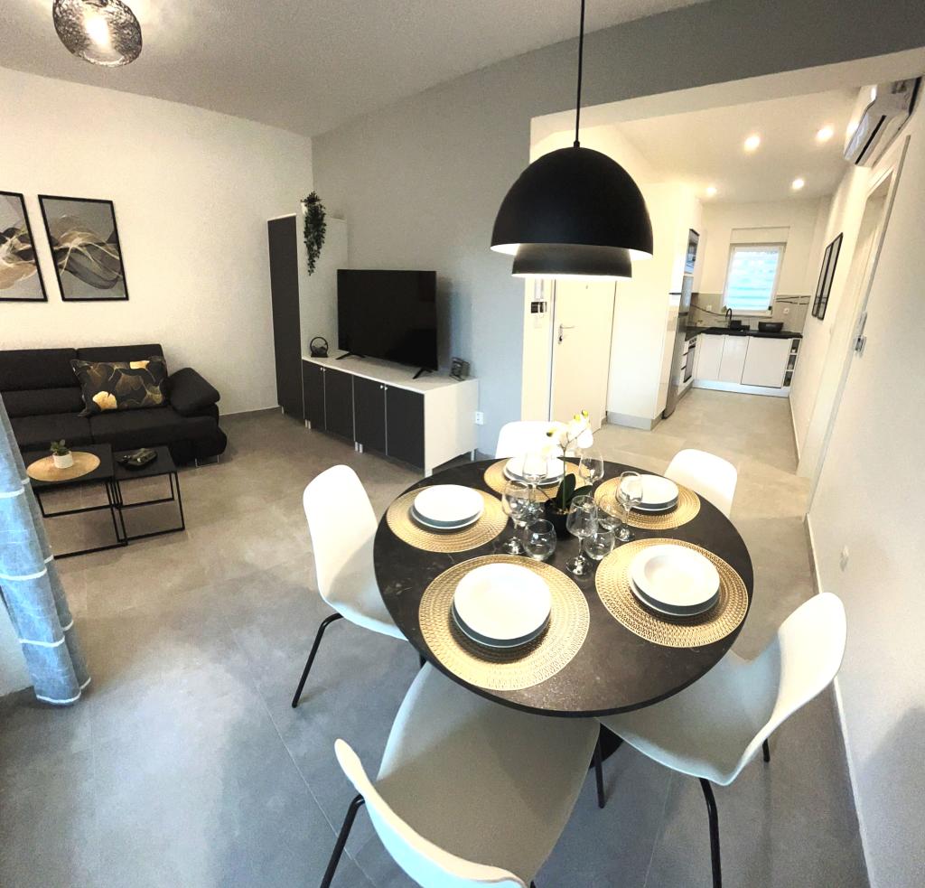 Les appartements Town Trogir bénéficient d'un emplacement privilégié sur la partie continentale de Trogir, à seulement 400 m du centre historique et à 1000 m de la plage de la ville nouvelle. Cette dernière est accessible par une promenade en bord de mer. Toutes les commodités principales sont accessibles à pied en 5 à 10 minutes. Les appartements Town Trogir sont neufs et situés dans un petit immeuble résidentiel de 6 appartements. D'une superficie d'environ 60 m², ils se trouvent au rez-de-chaussée, au 1er et au 2e étage. Décorés avec goût et entièrement équipés, ils comprennent 2 chambres, un séjour avec coin repas, une cuisine entièrement équipée, une salle de bains et, au rez-de-chaussée, une grande terrasse meublée. Le séjour et les chambres sont climatisés individuellement. Un parking gratuit est disponible devant l'immeuble. Le linge de lit et les serviettes sont fournis. Le Wi-Fi est gratuit. La taxe de séjour est incluse dans le prix.