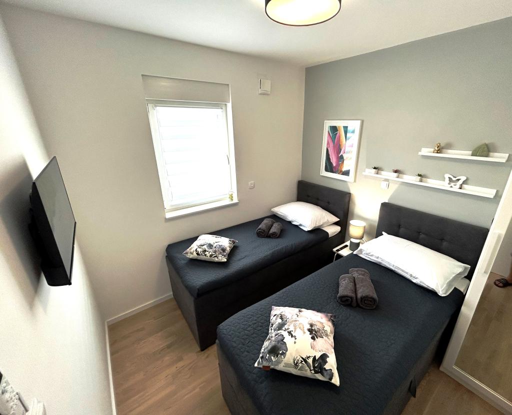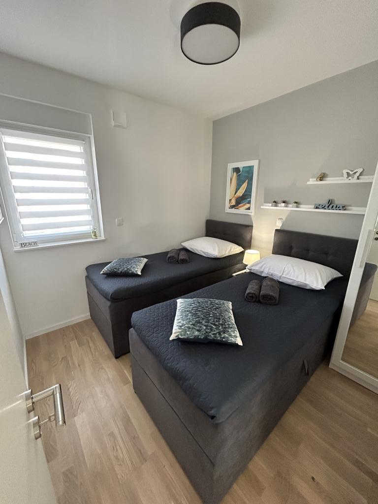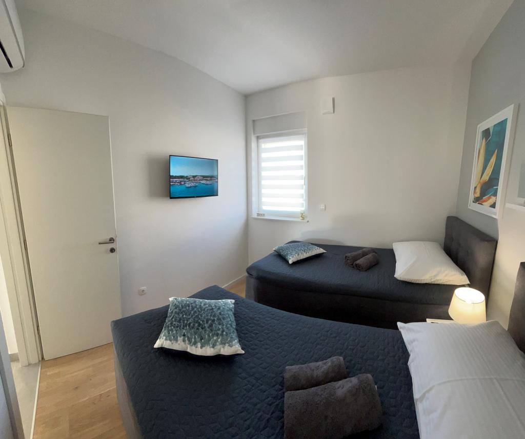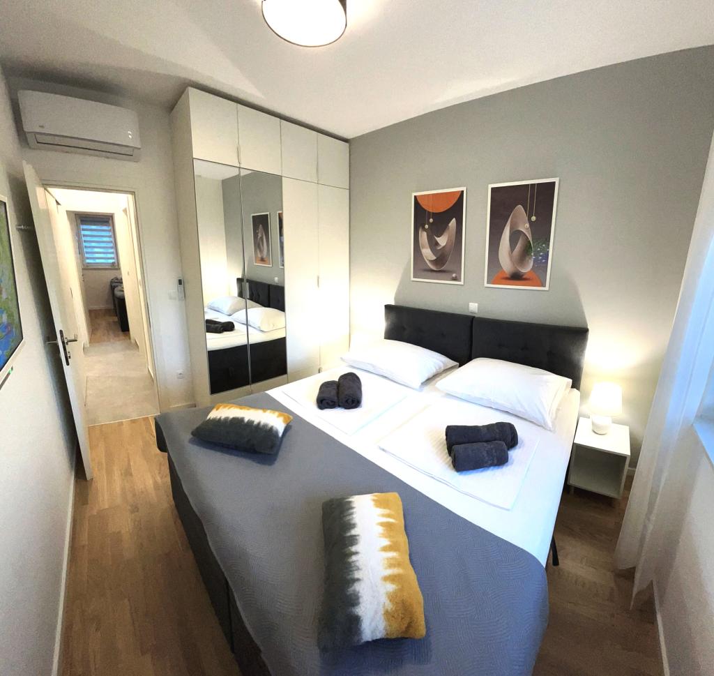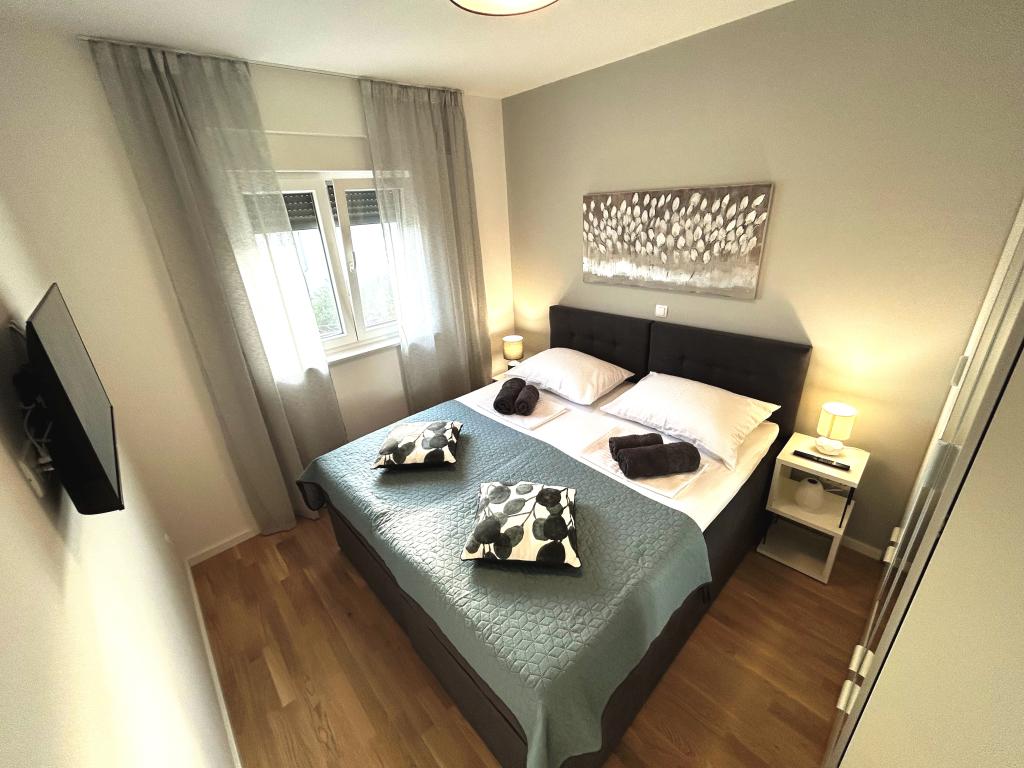 Les appartements Town Trogir bénéficient d'un emplacement privilégié sur la partie continentale de Trogir, à seulement 400 m du centre historique et à 1000 m de la plage de la ville nouvelle. Cette dernière est accessible par une promenade en bord de mer. Toutes les commodités principales sont accessibles à pied en 5 à 10 minutes. Les appartements Town Trogir sont neufs et situés dans un petit immeuble résidentiel de 6 appartements. D'une superficie d'environ 60 m², ils se trouvent au rez-de-chaussée, au 1er et au 2e étage. Décorés avec goût et entièrement équipés, ils comprennent 2 chambres, un séjour avec coin repas, une cuisine entièrement équipée, une salle de bains et, au rez-de-chaussée, une grande terrasse meublée. Le séjour et les chambres sont climatisés individuellement. Un parking gratuit est disponible devant l'immeuble. Le linge de lit et les serviettes sont fournis. Le Wi-Fi est gratuit. La taxe de séjour est incluse dans le prix.