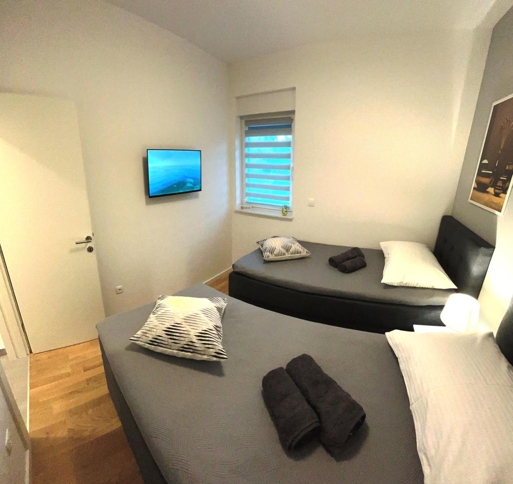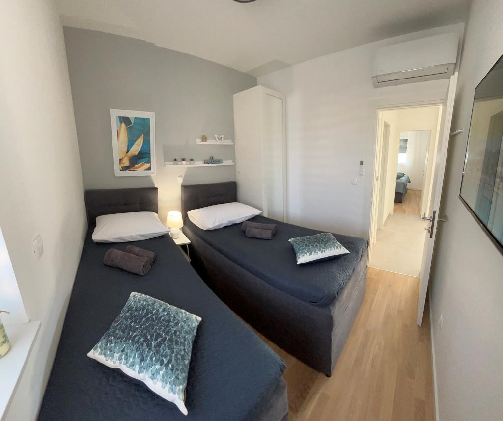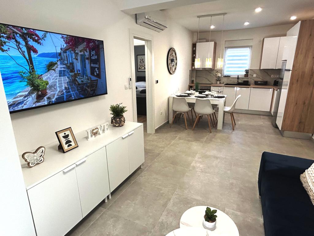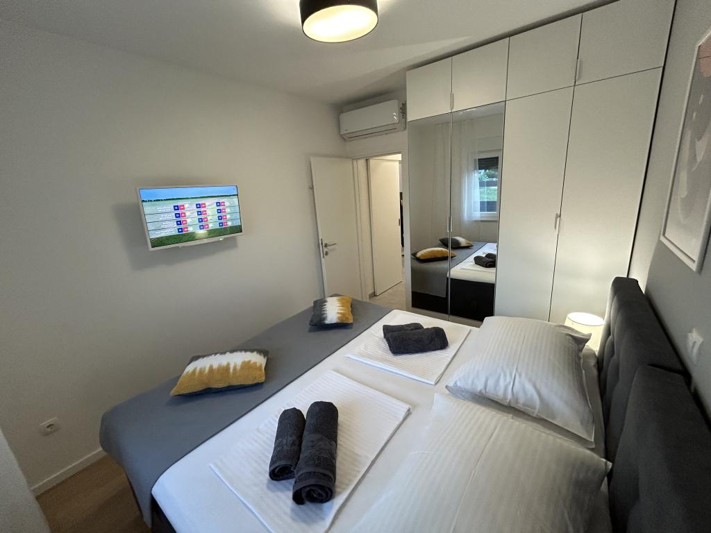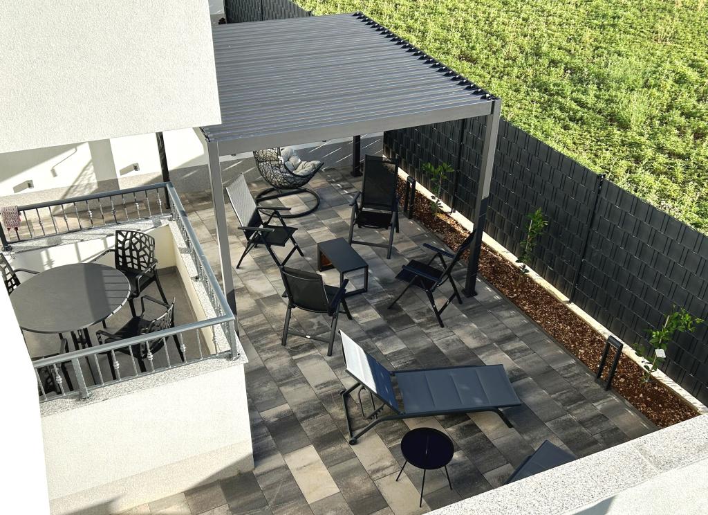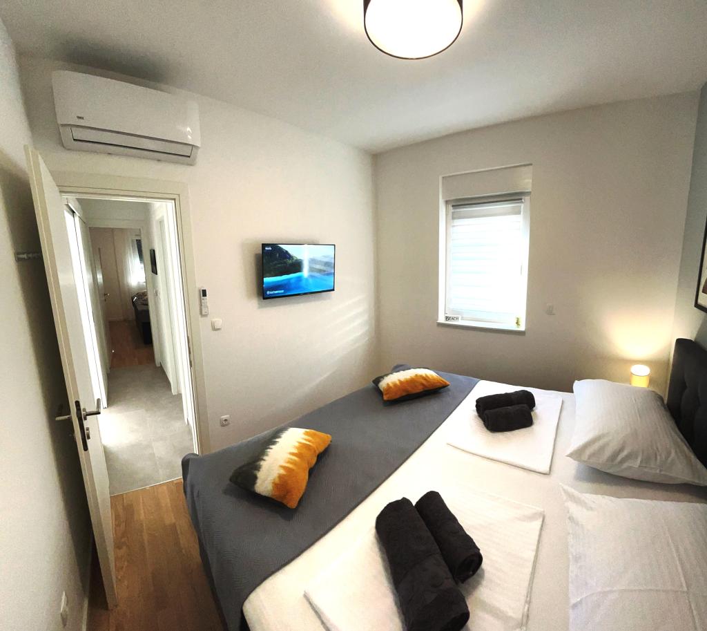 Les appartements Town Trogir bénéficient d'un emplacement privilégié sur la partie continentale de Trogir, à seulement 400 m du centre historique et à 1000 m de la plage de la ville nouvelle. Cette dernière est accessible par une promenade en bord de mer. Toutes les commodités principales sont accessibles à pied en 5 à 10 minutes. Les appartements Town Trogir sont neufs et situés dans un petit immeuble résidentiel de 6 appartements. D'une superficie d'environ 60 m², ils se trouvent au rez-de-chaussée, au 1er et au 2e étage. Décorés avec goût et entièrement équipés, ils comprennent 2 chambres, un séjour avec coin repas, une cuisine entièrement équipée, une salle de bains et, au rez-de-chaussée, une grande terrasse meublée. Le séjour et les chambres sont climatisés individuellement. Un parking gratuit est disponible devant l'immeuble. Le linge de lit et les serviettes sont fournis. Le Wi-Fi est gratuit. La taxe de séjour est incluse dans le prix.