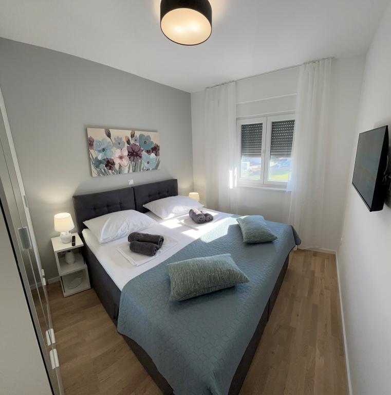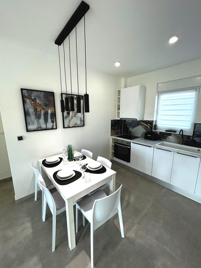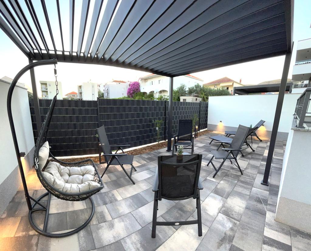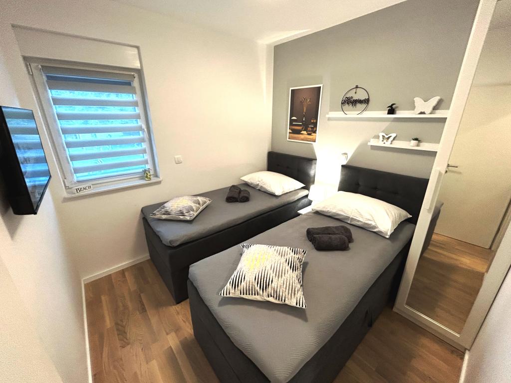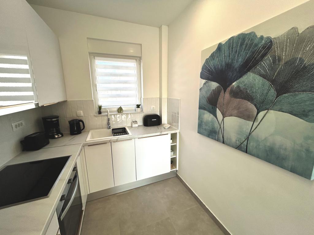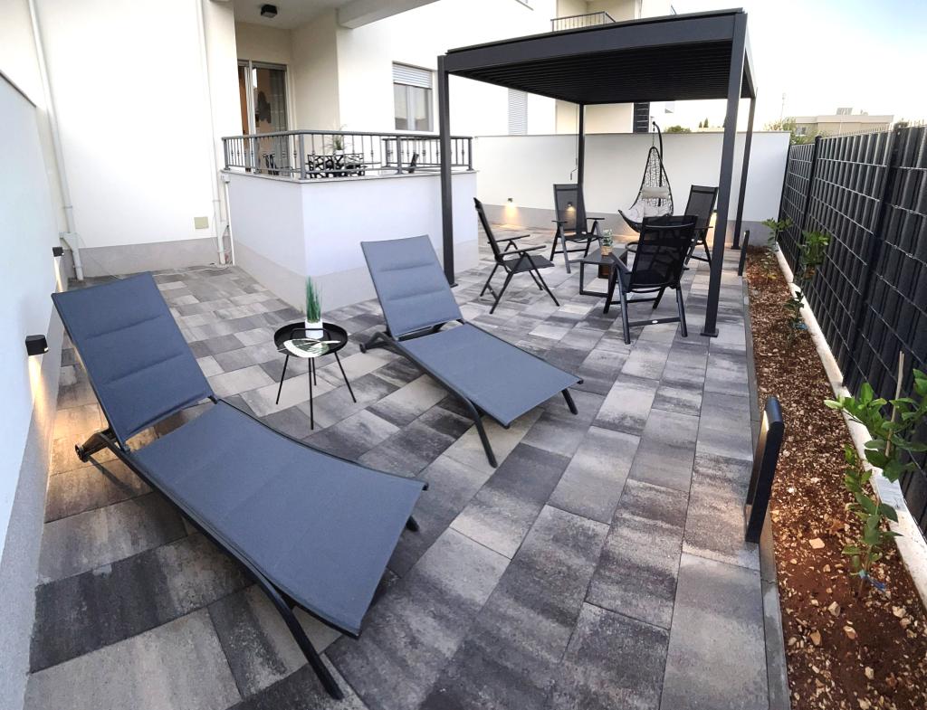 Les appartements Town Trogir bénéficient d'un emplacement privilégié sur la partie continentale de Trogir, à seulement 400 m du centre historique et à 1000 m de la plage de la ville nouvelle. Cette dernière est accessible par une promenade en bord de mer. Toutes les commodités principales sont accessibles à pied en 5 à 10 minutes. Les appartements Town Trogir sont neufs et situés dans un petit immeuble résidentiel de 6 appartements. D'une superficie d'environ 60 m², ils se trouvent au rez-de-chaussée, au 1er et au 2e étage. Décorés avec goût et entièrement équipés, ils comprennent 2 chambres, un séjour avec coin repas, une cuisine entièrement équipée, une salle de bains et, au rez-de-chaussée, une grande terrasse meublée. Le séjour et les chambres sont climatisés individuellement. Un parking gratuit est disponible devant l'immeuble. Le linge de lit et les serviettes sont fournis. Le Wi-Fi est gratuit. La taxe de séjour est incluse dans le prix.