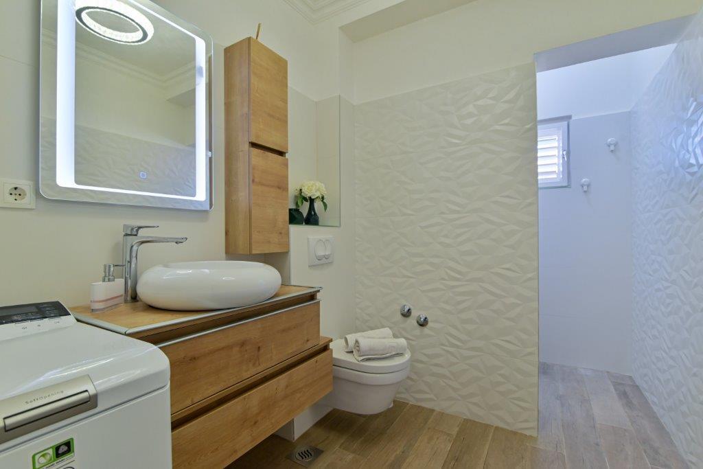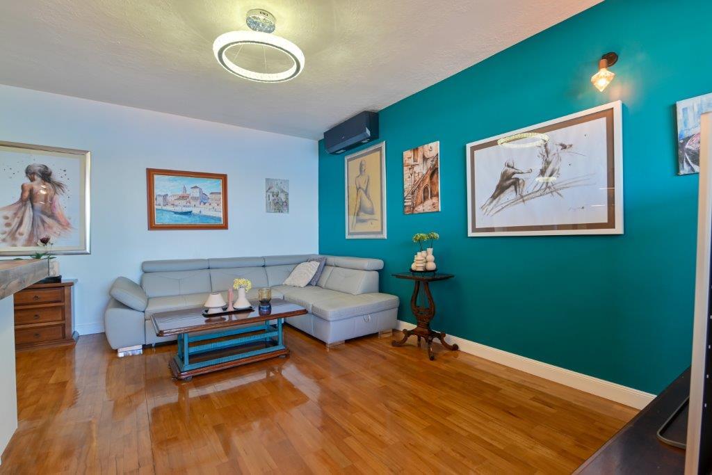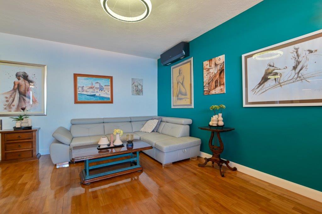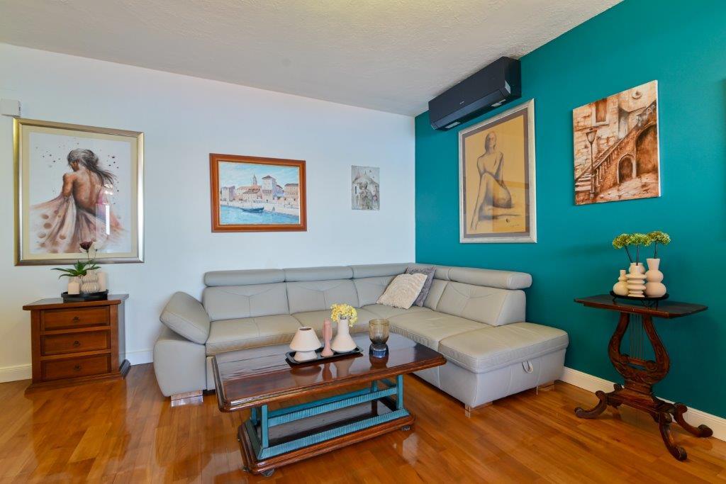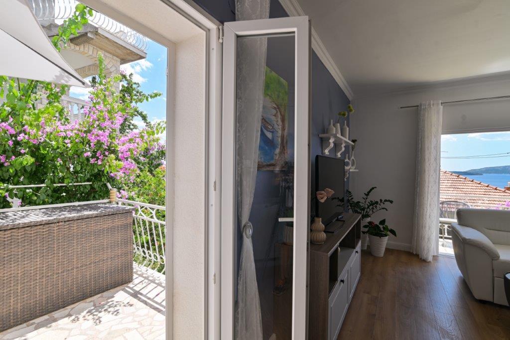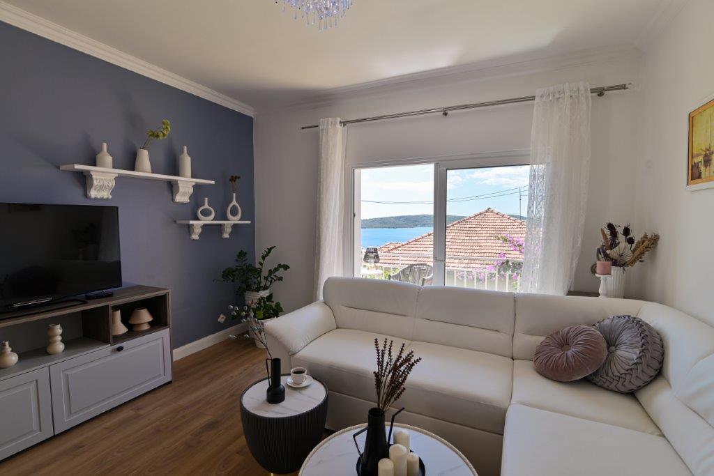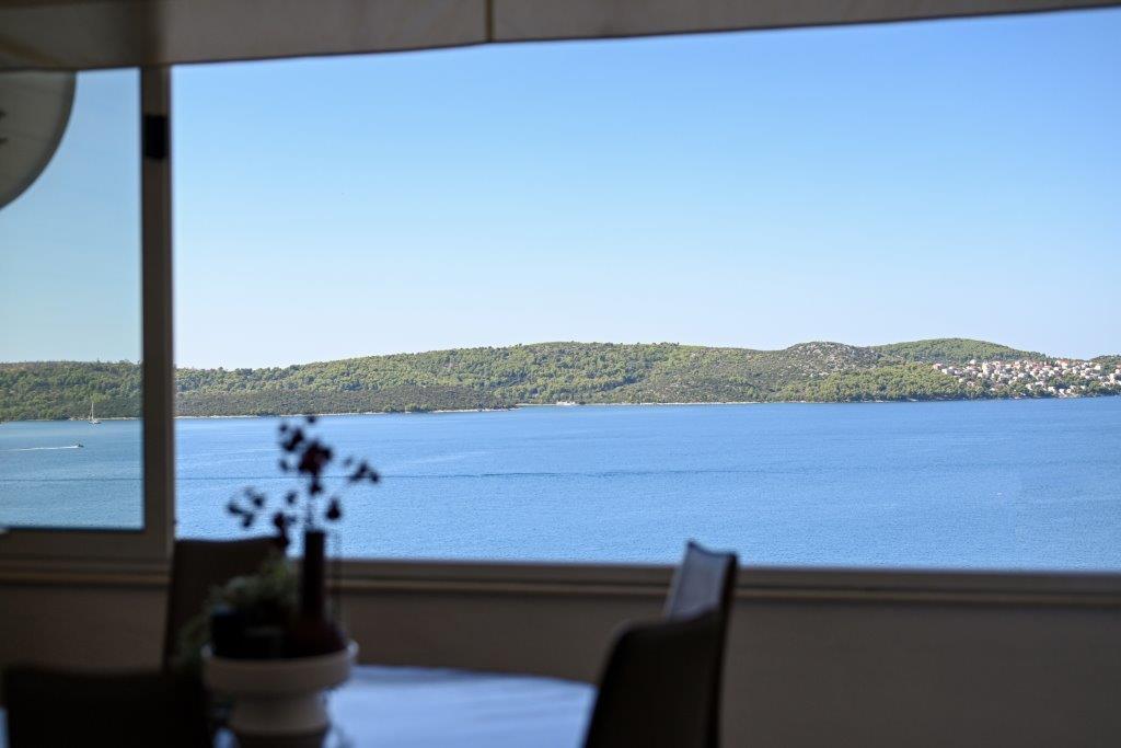 Ceci est une maison avec tekskluzivna appartements. Il est situé dans une zone attractive de la ville. Le côté sud de l'île de Ciovo (relié par un pont à la rive et la belle ville de Trogir (UNESCO)). La maison est située dans le quartier de Mirnyi, loin de la mer (plage de pins), un peu à 200m de la jolie plage de la ville à Okrug Gornji environ 700m. Distance des restaurants et des magasins a été complétée 150m, hôpital, bureau de poste et toutes les installations sont situées dans le centre-ville, qui est situé à environ 15 minutes. la marche et quelques 5 km de l'aéroport Split (offert le transport de l'aéroport par un accord préalable avec les propriétaires). La maison dispose de deux appartements. Chacune est entièrement équipée et offrent une vue magnifique sur la mer. On est classé avec 4 étoiles. Il est situé au rez-de-chaussée dispose d'une terrasse et deux balcons. 2 chambres, salon avec canapé-lit, salle à manger et cuisine et 2 salles de bains. Equipé d'un fond (air conditionné, Wi-Fi, la télévision par satellite, lave-linge, tous les appareils de cuisine, parking privé ... a. Le second est classé avec 3 étoiles. Il est le premier