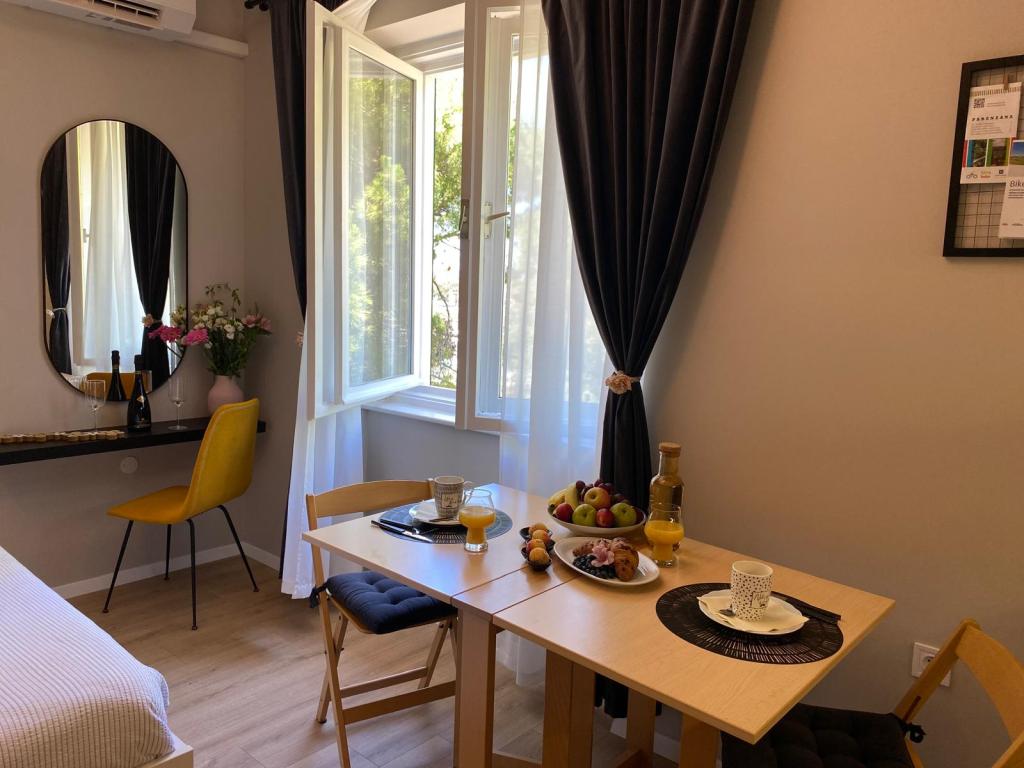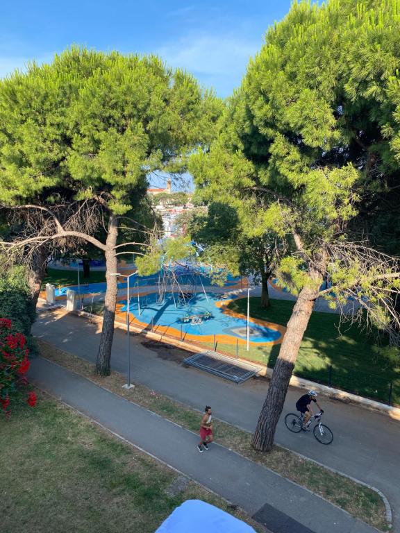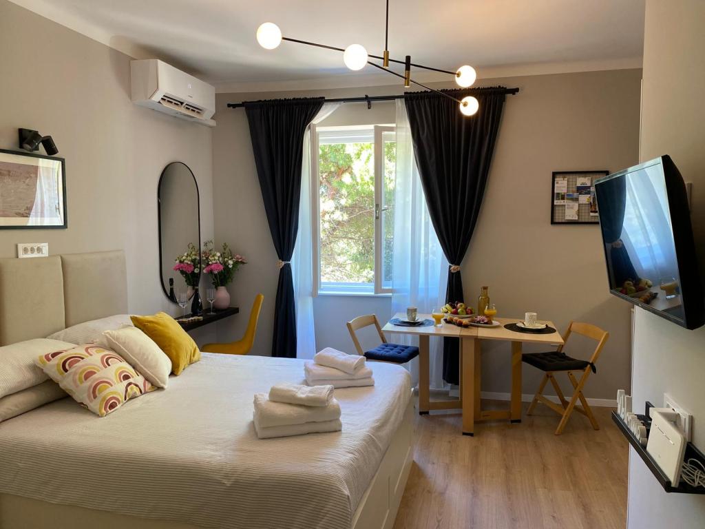Le studio « Victor 27 » est un charmant appartement situé au calme, en plein centre-ville, à proximité de toutes les commodités. Grâce à son emplacement idéal en bordure du front de mer, vous pourrez profiter de longues promenades, de balades à vélo ou d'un trajet à bord du petit train panoramique longeant la côte d'Umag. Depuis la fenêtre, vous apercevrez des pins verdoyants, ainsi que la mer et le vieux port de la ville en arrière-plan. Le studio se trouve au deuxième étage sans ascenseur et ne dispose pas de balcon. Le parking est gratuit dans l'immeuble. Sur demande préalable, il est possible d'ajouter un troisième lit d'appoint pour les enfants. La mise à disposition d'un vélo est également possible (à confirmer lors de la réservation).