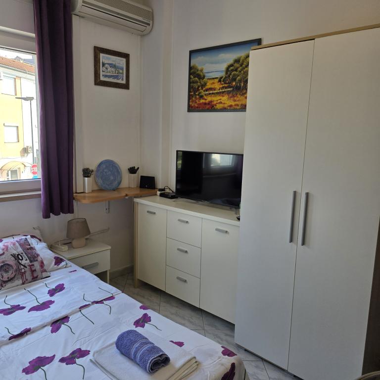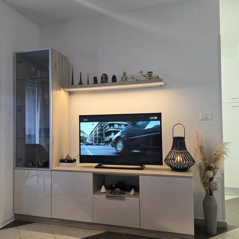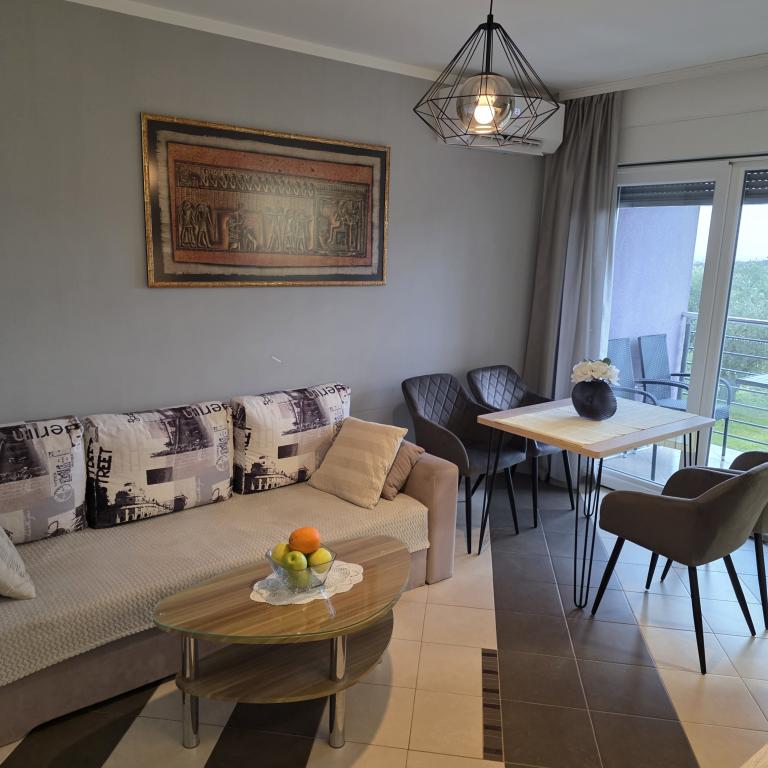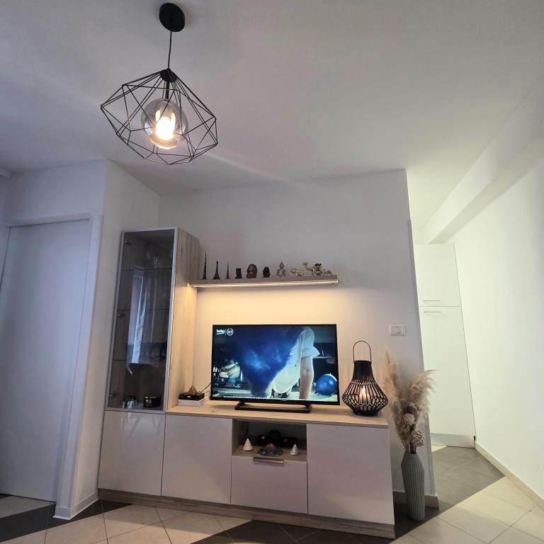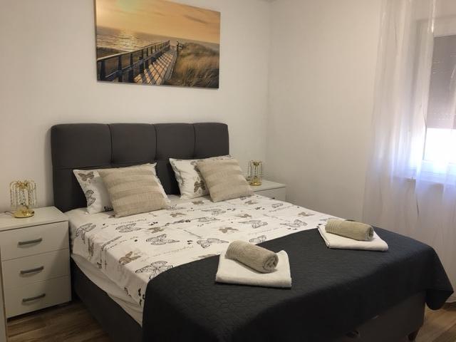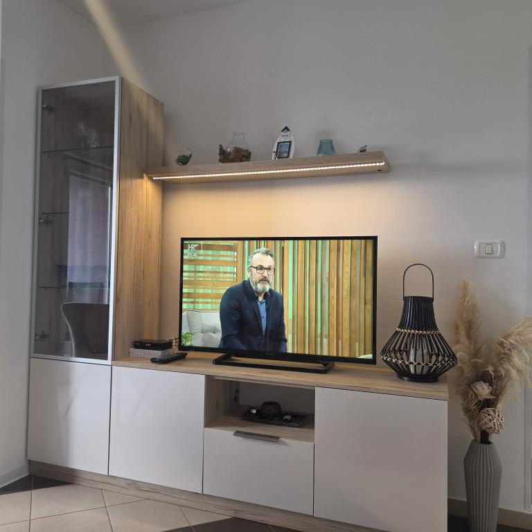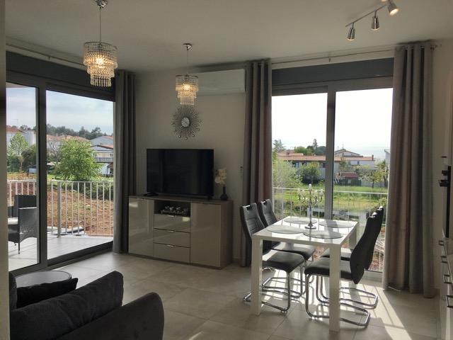 Les appartements Mirella 4 sont situés dans la résidence Lavande nouvellement construite avec vue sur la mer et une belle vue sur le coucher du soleil. Pour la mer et la belle plage de sable est à seulement 150m. Commerces, boulangerie et restaurants à 200m. Au centre d'Umag à 3 km. Le long de la mer, il y a une promenade jusqu'au centre d'Umag et la possibilité est le transport en train touristique. Les appartements sont climatisés et entièrement équipés avec tous les appareils. Salle de bain avec douche massante, lave-linge, sèche-cheveux, fer à repasser. Cuisine avec lave-vaisselle, micro-ondes, cafetière, bouilloire, grand réfrigérateur avec congélateur et tout le reste pour que les clients se sentent chez eux. Une connexion Internet et un parking sécurisé sont disponibles gratuitement. Le prix comprend l'utilisation de la piscine, des transats, de la douche, des deux places, de la table et des chaises dans la partie couverte de la terrasse au bord de la piscine. Merci d'avoir choisi Apartments Mirella, j'espère qu'en retour nous satisferons vos souhaits pendant votre séjour dans nos appartements. Notre objectif est votre satisfaction et votre recommandation. Chers clients, bienvenue aux appartements Mirella!
