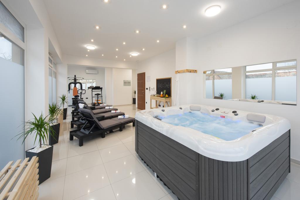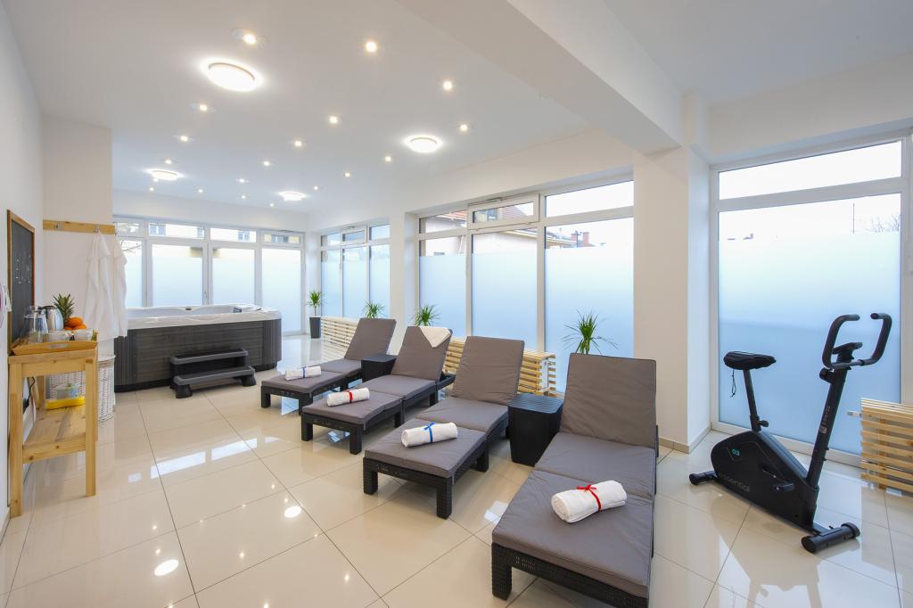 Le prix de l'appartement comprend un espace bien-être avec baignoire hydromassante, sauna, transats et appareils de fitness. En outre, d'autres installations telles qu'un sac de boxe, des fléchettes et un baby-foot sont incluses.