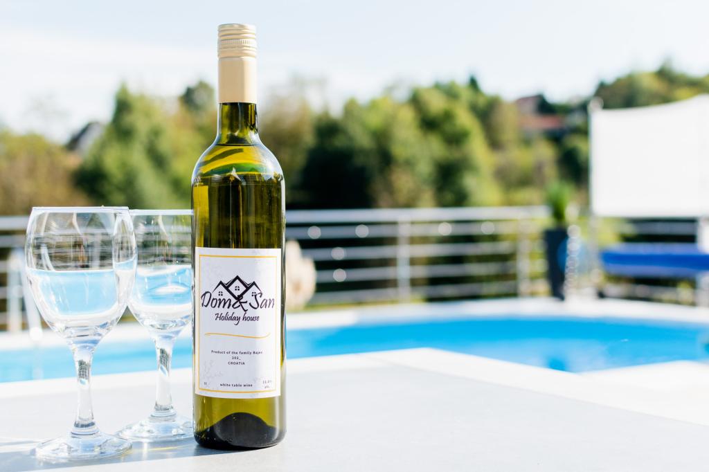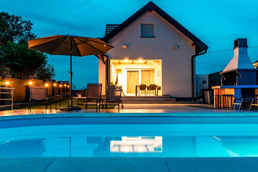 Piscine - Une piscine est l'un des meilleurs moyens de combattre la chaleur, surtout en été et idéale pour ceux qui veulent simplement faire quelque chose d'amusant. Sauna - avec les plaques chauffantes les plus modernes en fibre de carbone organique. Les plaques chauffantes en fibre de carbone organique rendent la désintoxication et la perte de poids encore plus efficaces. Avec fonction d'ionisation de l'oxygène. Jacuzzi - le système d'eau salée rend l'eau plus naturelle et agréable pour un usage quotidien. Beaucoup veulent éviter les odeurs de chlore, les démangeaisons des yeux et de la peau. L'un des plus grands avantages d'un système d'eau salée par rapport au chlore est la possibilité de griller - Un gril avec un bar extérieur est un endroit idéal pour rassembler et préparer vos délices préférés. Vin domestique - La superficie relativement petite de notre vignoble nous permet de cultiver nos plantations en toute indépendance et de produire maison