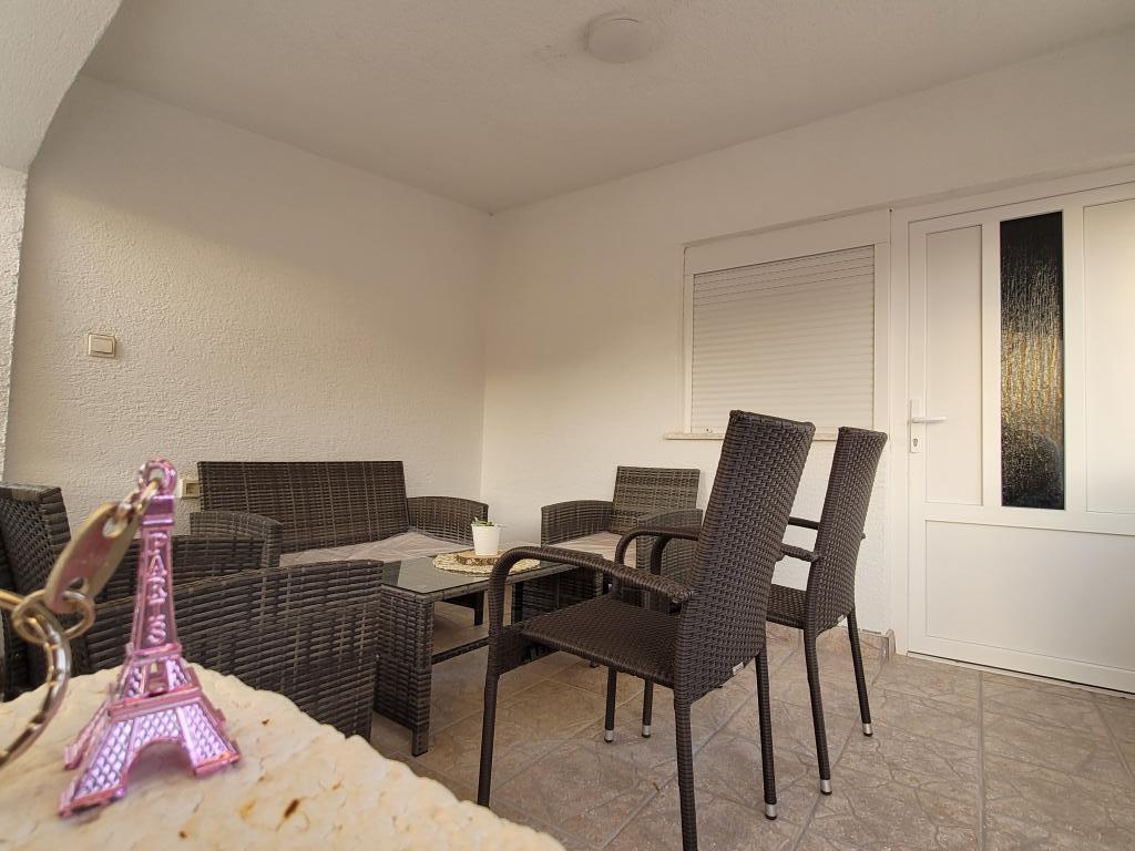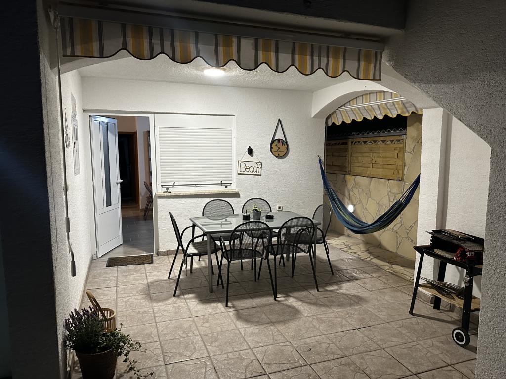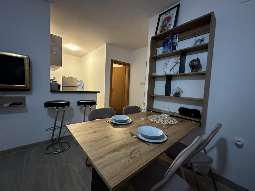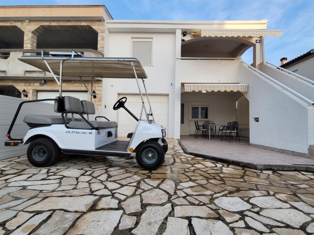 Appartement à louer pour 4+2 personnes sur l'île de Vir, Žitna I., dans une rue sans issue et calme, parking prévu pour 3 véhicules, cour, terrasse, barbecue, distance de la plage et du centre de Vir 750 mètres , 8 minutes à pied ou 2 minutes en voiture Un "Clubcar" pour 4 personnes est fourni avec l'appartement moyennant un supplément de 15 euros par jour, et il est possible de louer un cyclomoteur électrique pour 15 euros par jour. L'appartement se compose de deux chambres, d'une salle de bain avec WC, d'une cuisine et d'un salon avec salle à manger, dans le salon il y a un canapé-lit. Climatisation, wi-fi, TV, micro-ondes, machine à glaçons, sèche-cheveux, fer à repasser fourni.