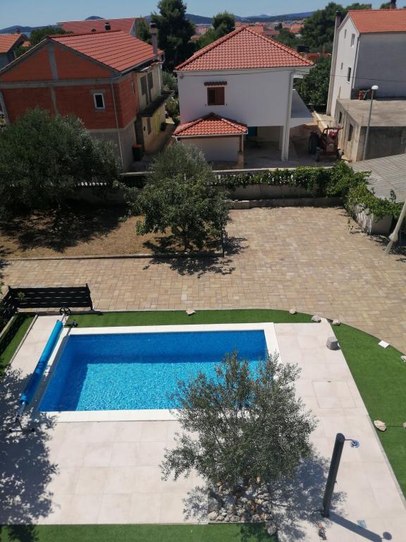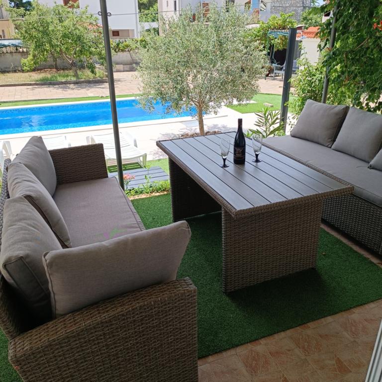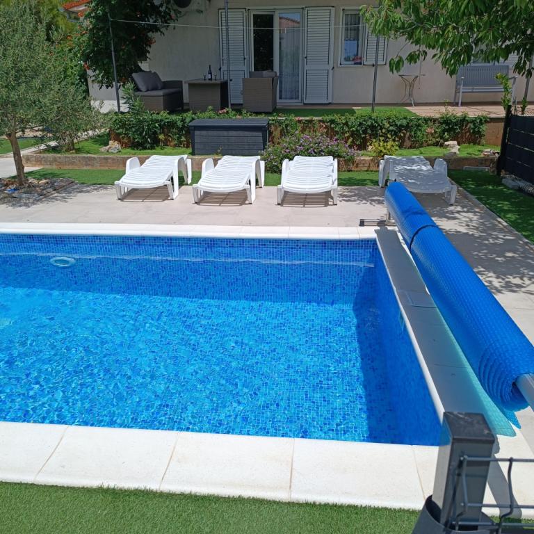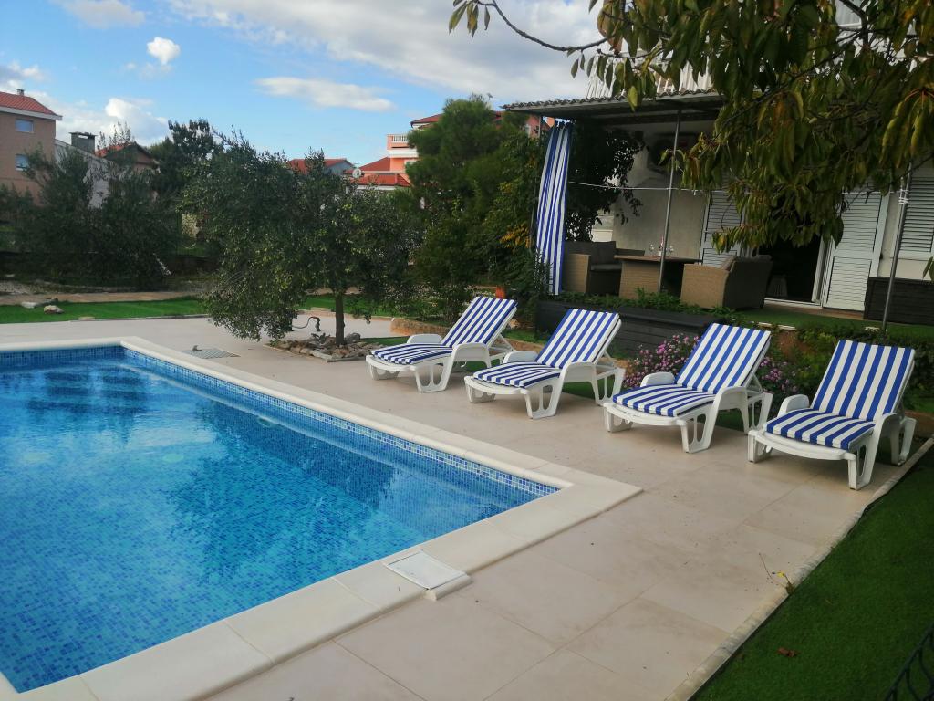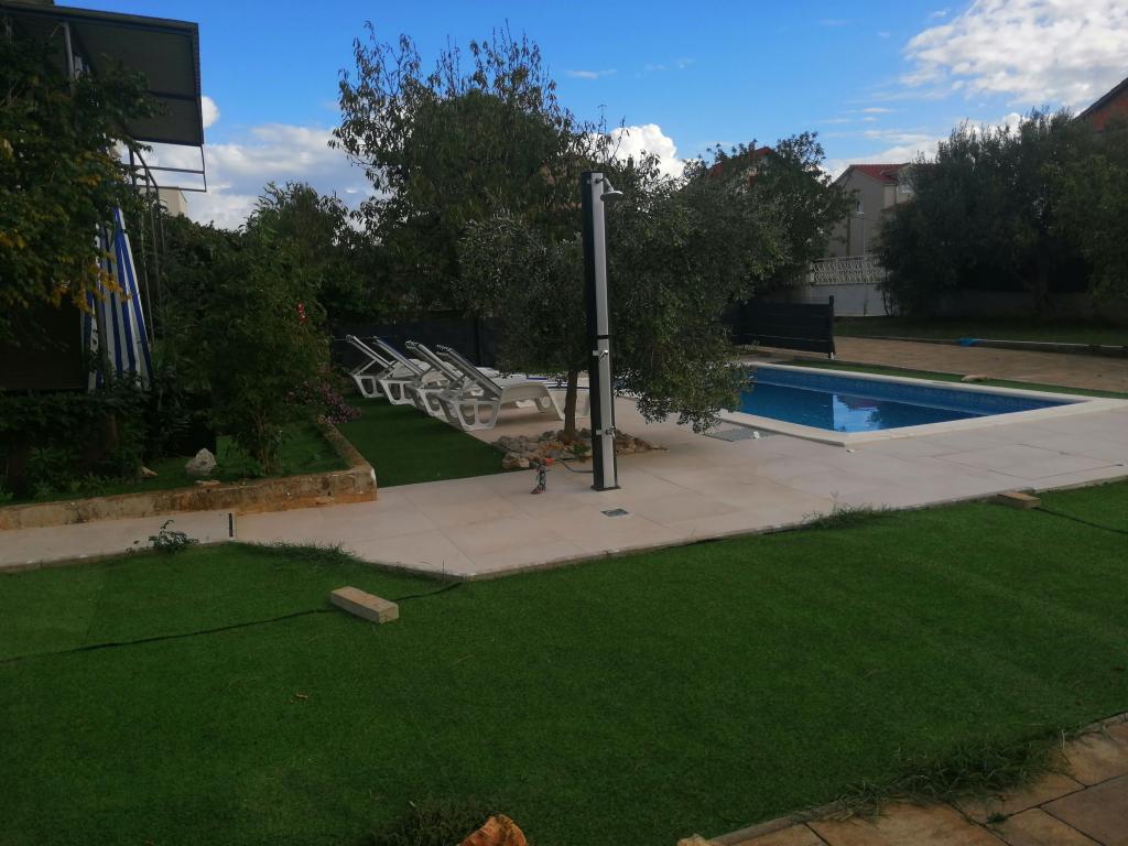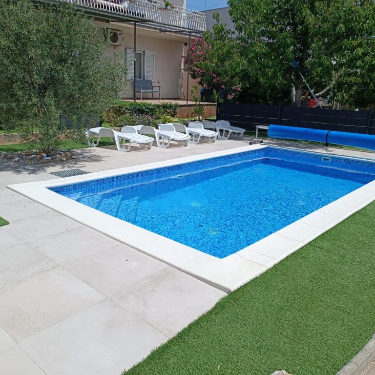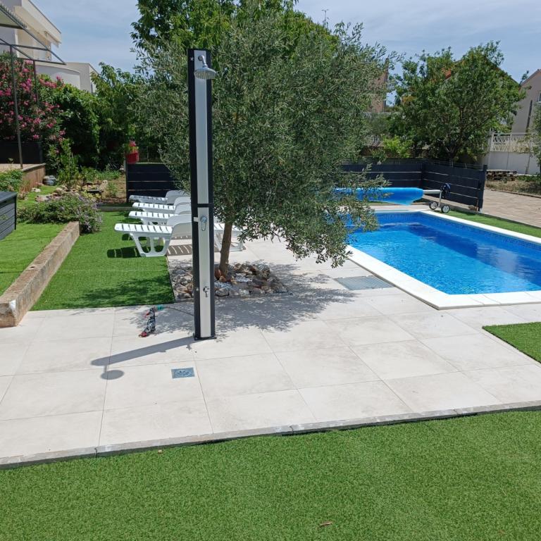 Grands appartements récemment rénovés avec piscine extérieure, rien que pour vous ! Comme une maison de vacances ! Cuisine entièrement rénovée avec appareils électroménagers neufs (réfrigérateur, congélateur, four, plaques de cuisson, micro-ondes, bouilloire, lave-vaisselle, lave-linge, hotte aspirante). Vaisselle et ustensiles de cuisine. Séjour avec canapé d'angle convertible en lit double. Télévision par satellite. Chambres avec lits doubles spacieux. Linge de lit fourni. Toutes les chambres sont climatisées. Deux salles de bains récemment rénovées avec toilettes et douches à l'italienne. Lave-linge, matériel de repassage, sèche-cheveux. Aspirateur et produits d'entretien, papier toilette, savon, serviettes. Terrasse de 30 m² avec mobilier de jardin, barbecue et chaises longues au bord de la piscine. Grand jardin de 1 300 m² planté d'arbres méditerranéens. Parking gratuit dans la cour ! Les aéroports de Zadar et de Split sont à environ 60 km. À proximité des parcs nationaux de Krka et des Kornati.
