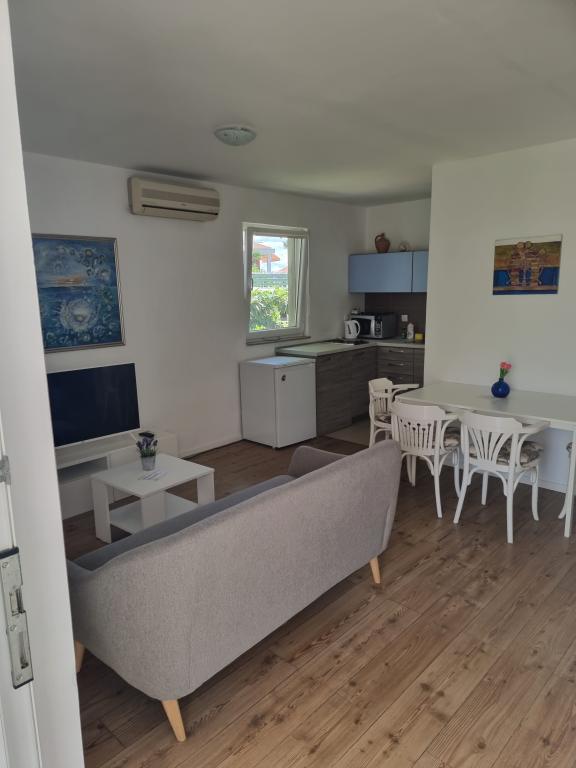 Appartement entièrement meublé dans un quartier calme de la ville, situé à 100 mètres de la mer et à 200 mètres du centre-ville. L'appartement dispose de 2 chambres et un canapé-lit, une salle de bains et WC, et une cuisine entièrement équipée. La cour est spacieuse avec beaucoup de verdure et une atmosphère agréable pour la soirée avec un barbecue. Parking pour 2 voitures.
