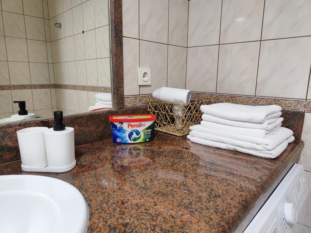 Il y a des épices, de l'huile, du vinaigre et du détergent dans la cuisine. Des capsules sont également fournies avec la machine à café. Des tablettes et capsules pour machines à laver et lave-vaisselle sont disponibles avec les appareils. La planche à repasser et le fer à repasser sont situés dans l'espace commun et sont à la disposition de tous. Nous sommes à votre disposition pour toutes demandes et suggestions, que ce soit pour des excursions, des locations de bateaux, de vélos, etc.