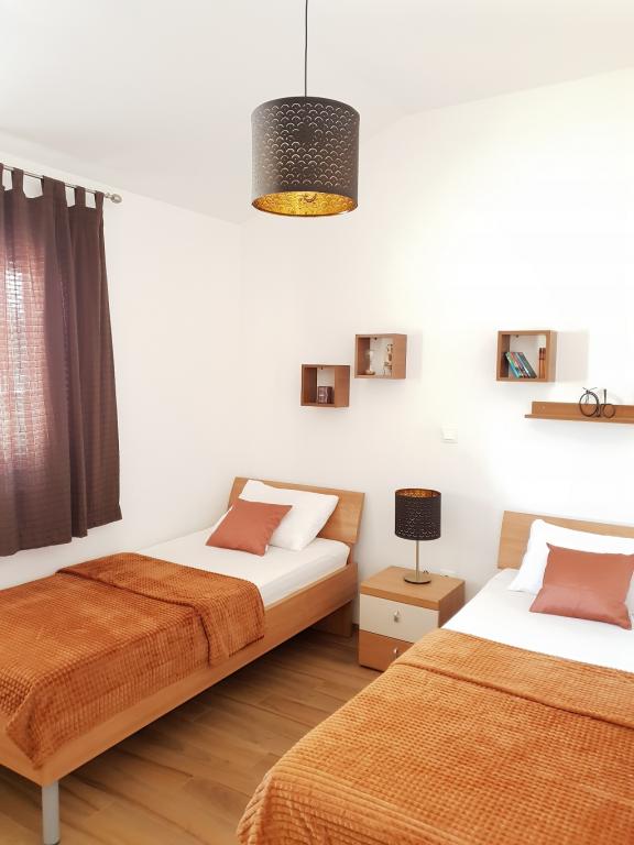 Appartements de luxe, l'un de 84 m2 (ID : 24697) et l'autre de 58 m2 (ID : 24698) sont situés au premier étage d'une maison familiale située dans un quartier calme de Vodice, entouré de 1700 m2 de jardin méditerranéen, à seulement 10 minutes. à pied du centre et de la plage la plus proche, et à 5 min. de la boutique. Les appartements sont décorés de façon moderne, climatisés, disposent de TV SAT, Internet (Wi-Fi), lave-linge, lave-vaisselle. Les deux sont des deux pièces, avec le fait que les chambres avec un lit double sont situées sur les galeries, qui sont également climatisées. Devant la maison il y a une place de parking couverte et une cuisine d'été avec barbecue. Au centre de Vodice, dans un quartier calme, à l'adresse Plimica 96A, nous louons une maison de vacances avec cour et parking. La maison est équipée de tout le nécessaire pour passer des vacances agréables et un séjour plus long. Envoyez-nous votre demande et nous vous proposerons notre meilleure offre. accueillir :)
