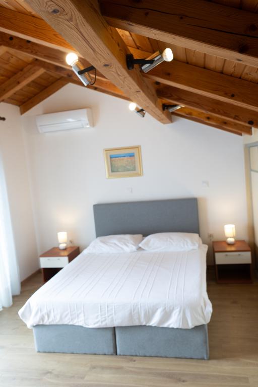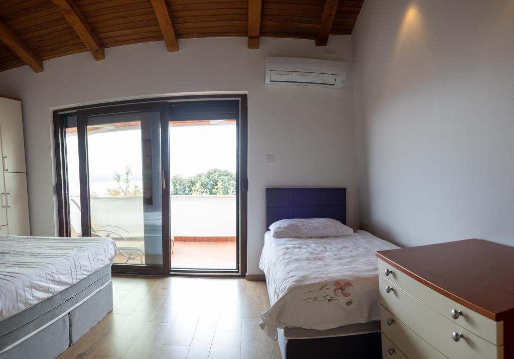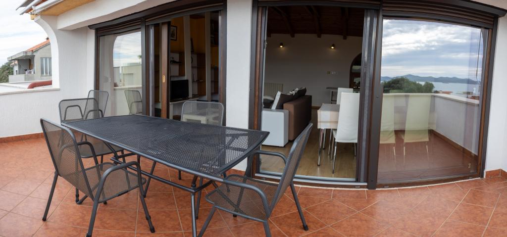 Spacieux appartement de 3 pièces (100 m²) au 2ème étage de la maison rustique Anica, située dans le quartier paisible de Diklo, à seulement 6 km du centre de Zadar et à 100 m de la mer. L'appartement comprend un grand séjour/salle à manger (38 m²) avec télévision par satellite, climatisation et accès à une terrasse avec vue sur la mer. Deux chambres confortables offrent une configuration flexible : l'une avec un lit double, l'autre avec un lit simple et un lit double, et une salle d'eau privative avec douche et WC. Toutes deux sont climatisées et donnent accès à une terrasse. La cuisine ouverte entièrement équipée comprend un four, un lave-vaisselle, une plaque vitrocéramique, un micro-ondes et une machine à café. Une salle d'eau supplémentaire avec douche et WC ainsi qu'un lave-linge sont à la disposition des hôtes. Trois terrasses exposées plein sud, meublées et offrant une vue sur la mer, sont idéales pour se détendre. Parking privé pour deux voitures.