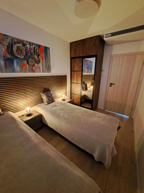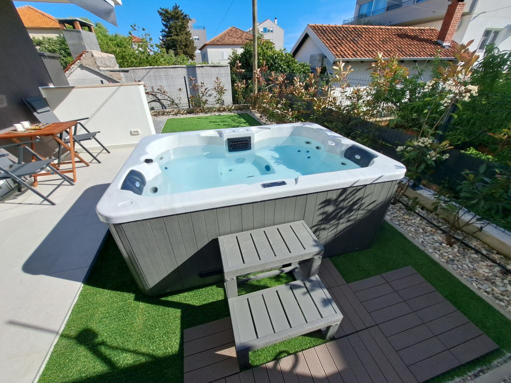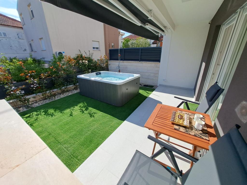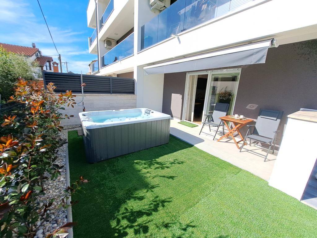 L'appartement est situé au rez-de-chaussée d'un immeuble dans le quartier calme de Stanovi à Zadar, qui n'est pas visité par des foules de touristes. À proximité immédiate (à pied), vous trouverez des magasins, des restaurants, des cafés et le centre sportif et de loisirs de Višnjik - tout ce dont vous avez besoin pour votre séjour, sans avoir besoin d'utiliser une voiture. L'appartement dispose d'une entrée séparée depuis son propre jardin (environ 55 m2), où les clients ont accès à un jacuzzi privé. Le jardin est entouré de verdure. L'appartement se compose d'un séjour avec cuisine et coin repas, de 2 chambres (chacune avec un lit double pouvant être séparé en deux lits simples), d'une salle de bain avec douche et d'une loggia couverte (environ 7m2). La partie du jardin avec le jacuzzi peut être ombragée grâce à un store automatique. Nous disposons de 2 places de parking privées devant l'immeuble. (sans frais supplémentaires) Nous proposons également notre propre borne de recharge pour voitures électriques. (frais supplémentaires)