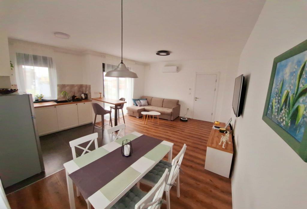 APPARTEMENT MODERNE 2+2 À LOUER À ZAGREB – LOCATION À LA JOURNÉE (BANI 76) Un appartement 2+2 moderne et entièrement équipé est à louer dans un emplacement privilégié à Zagreb, dans le quartier calme de Bani, rue Bani 76. L'appartement est idéal pour les couples, les familles ou les voyageurs d'affaires qui recherchent confort, intimité et bonnes connexions avec la ville. Description de l'appartement : L'appartement comprend une chambre confortable avec un lit double, un salon à la décoration moderne avec un canapé-lit d'angle (2 couchages supplémentaires), une cuisine entièrement équipée et une salle à manger, une salle de bain avec baignoire, ainsi qu'un couloir et une entrée. Le salon s'ouvre sur un grand balcon, idéal pour prendre un café le matin ou se détendre le soir. Équipements : Wi-Fi gratuit, climatisation, Smart TV, lave-linge, cuisine entièrement équipée (réfrigérateur, four, plaques de cuisson, micro-ondes, bouilloire), serviettes et draps propres, sèche-cheveux et produits de toilette de base, parking disponible devant l'immeuble.