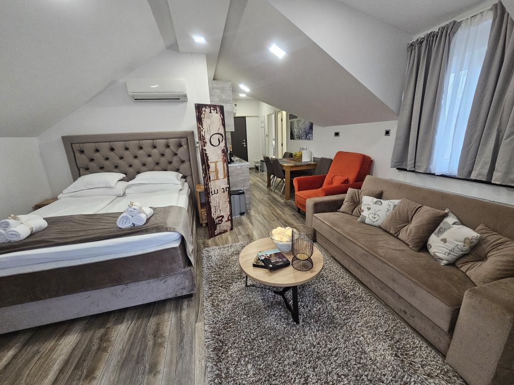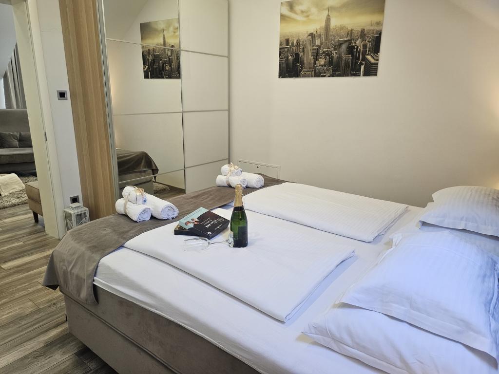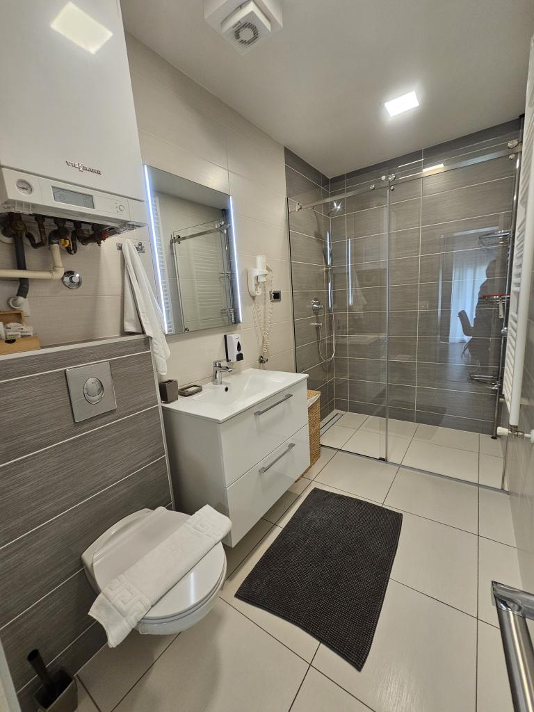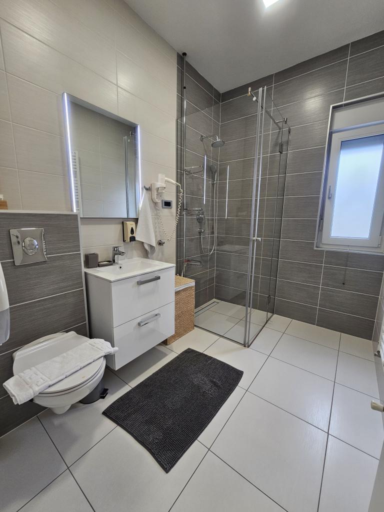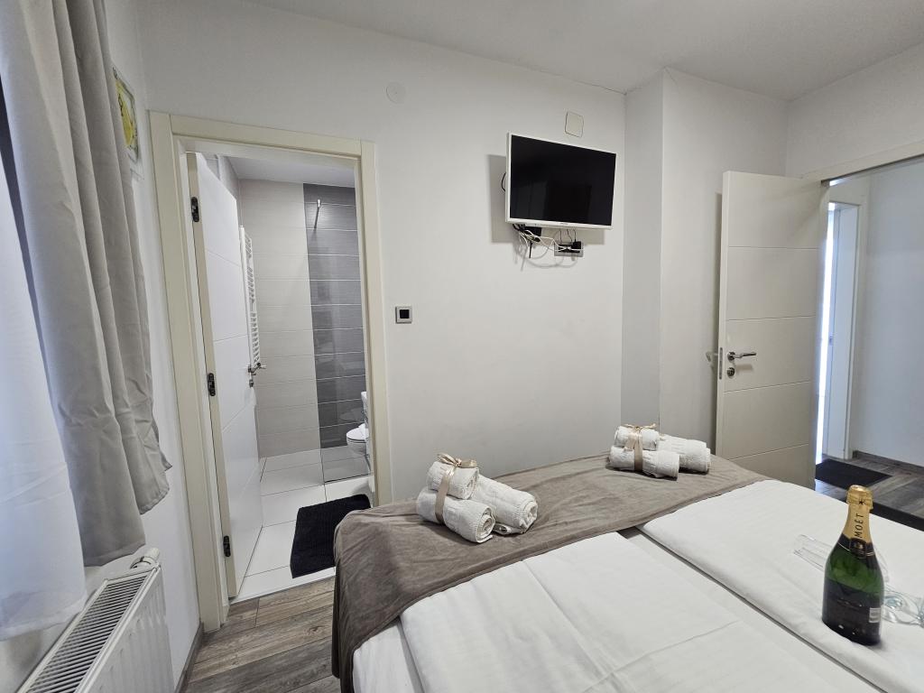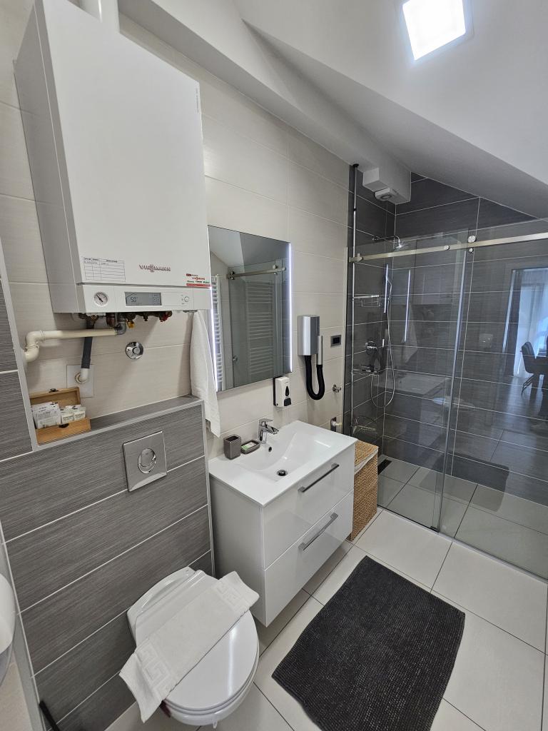 La Villa Agram est située dans une rue calme (adresse : Poljanička 2a) dans le vieux quartier Trešnjevka de Zagreb. L'installation a été entièrement nouvellement construite et a ouvert ses portes en 2018. Nos clients bénéficient d'un parking gratuit à l'intérieur et devant le bâtiment. La Villa Agram comprend 5 appartements luxueusement meublés. Le magasin le plus proche se trouve à 300 m du bâtiment, tandis que les restaurants et cafés sont à environ 500 m. Le rond-point de Ljubljanica se trouve à environ 800 m de la Villa Agram, vous pourrez donc vous rendre au centre ou dans une autre partie de Zagreb en tramway ou en bus. Tram n°. La ligne 12, qui mène directement à Trg ban J. Jelačić, arrive à destination en seulement 19 minutes. Chaque invité est accueilli avec du linge de lit fraîchement lavé et propre et un ensemble de serviettes. Les salles de bains sont entièrement équipées de tous les accessoires de salle de bain (papier toilette, savon liquide et dur, gel douche, après-shampooing, bonnet de douche, chaussons de bain, peigne, nécessaire de maquillage) et d'un sèche-cheveux mural.