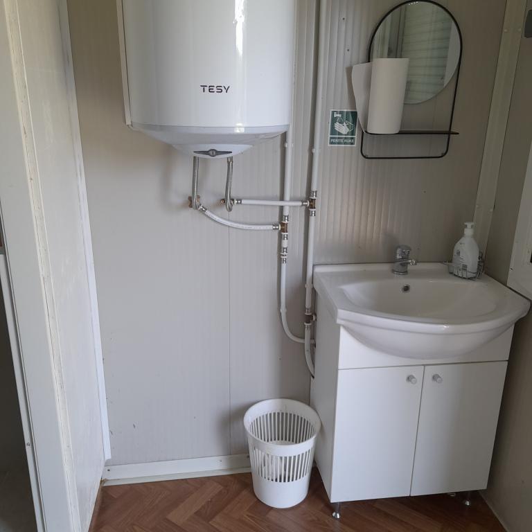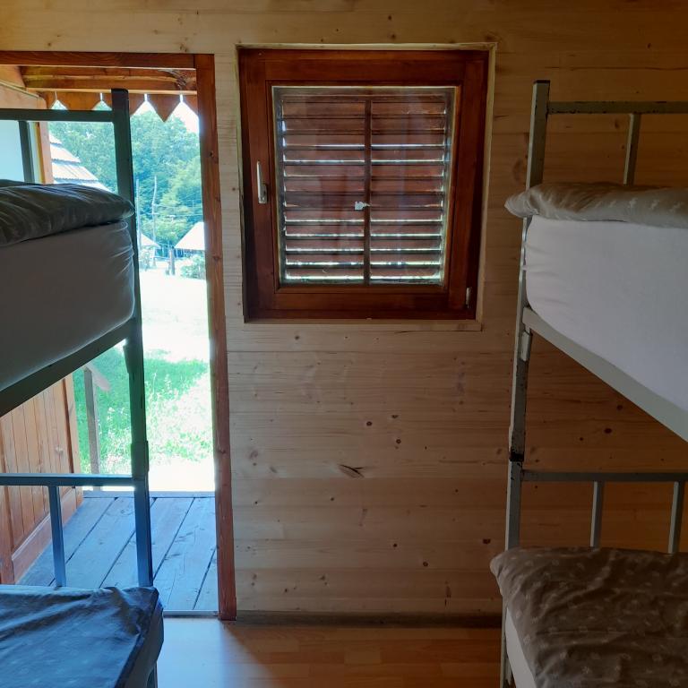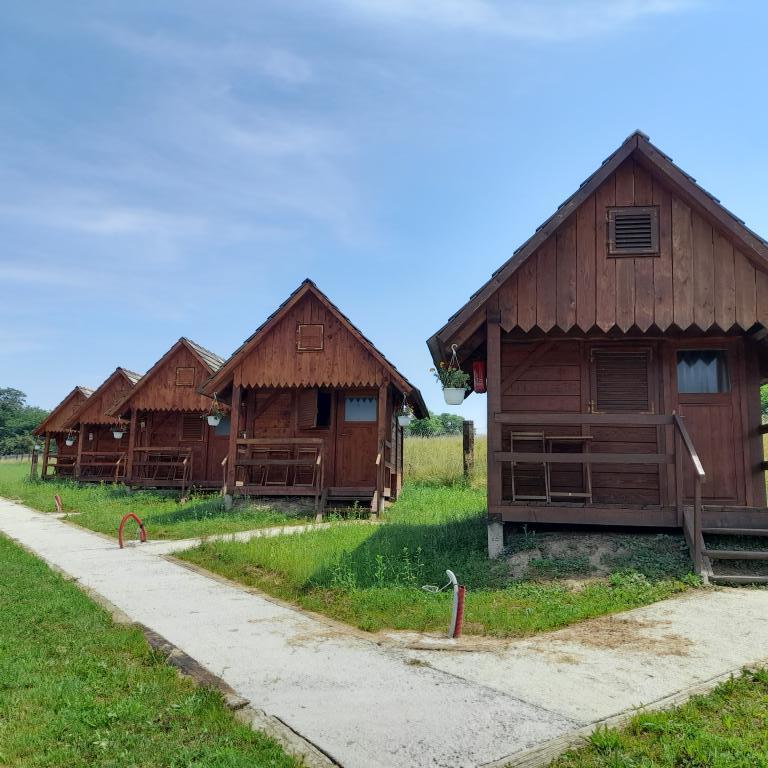 Les maisons sont construites en bois, un matériau naturel. De construction traditionnelle, elles mesurent 4 x 3 m. Elles peuvent accueillir 5 adultes et deux enfants jusqu'à 15 ans, ou 3 adultes. Chaque maison dispose d'une terrasse avec vue. Les toilettes et les douches se trouvent dans les sanitaires centraux, à seulement 20 mètres. Elles sont situées dans un cadre naturel magnifique, à proximité immédiate du parc d'attractions.
