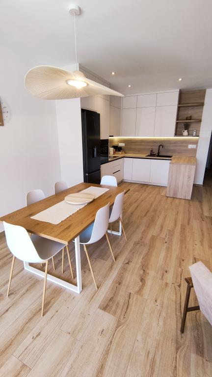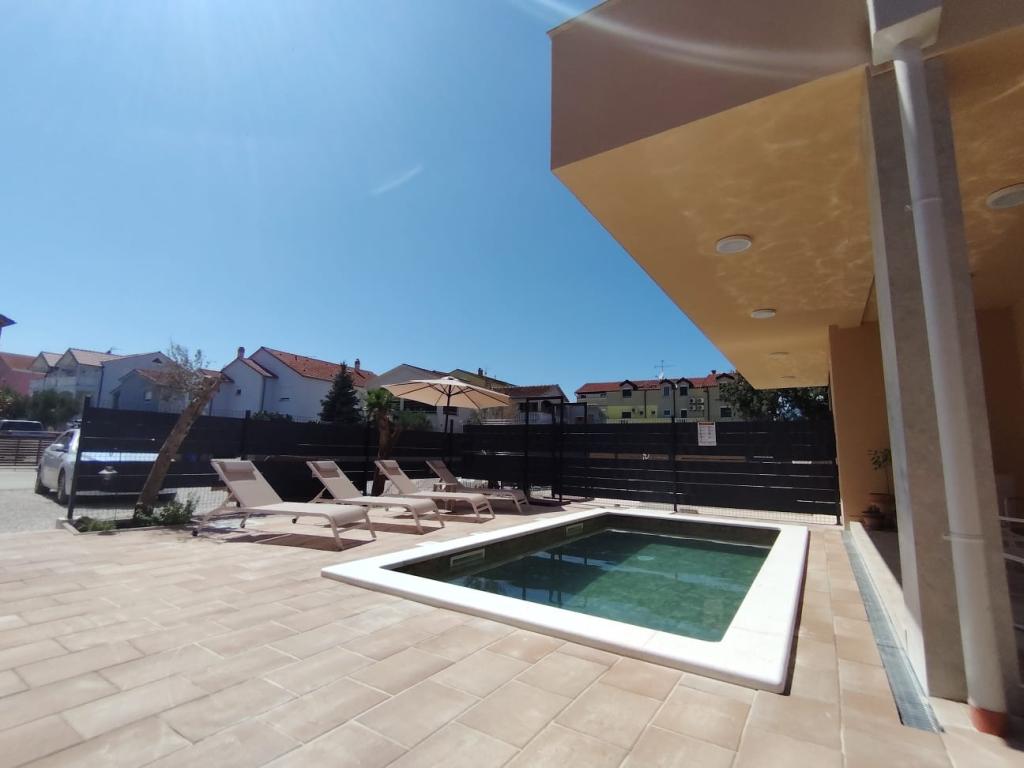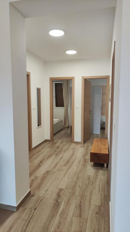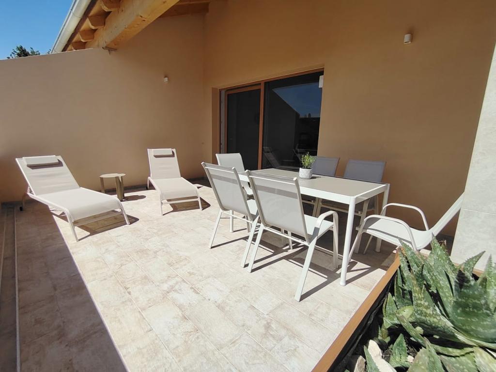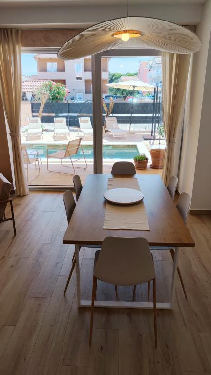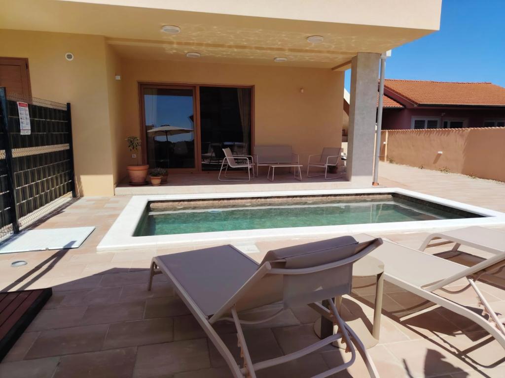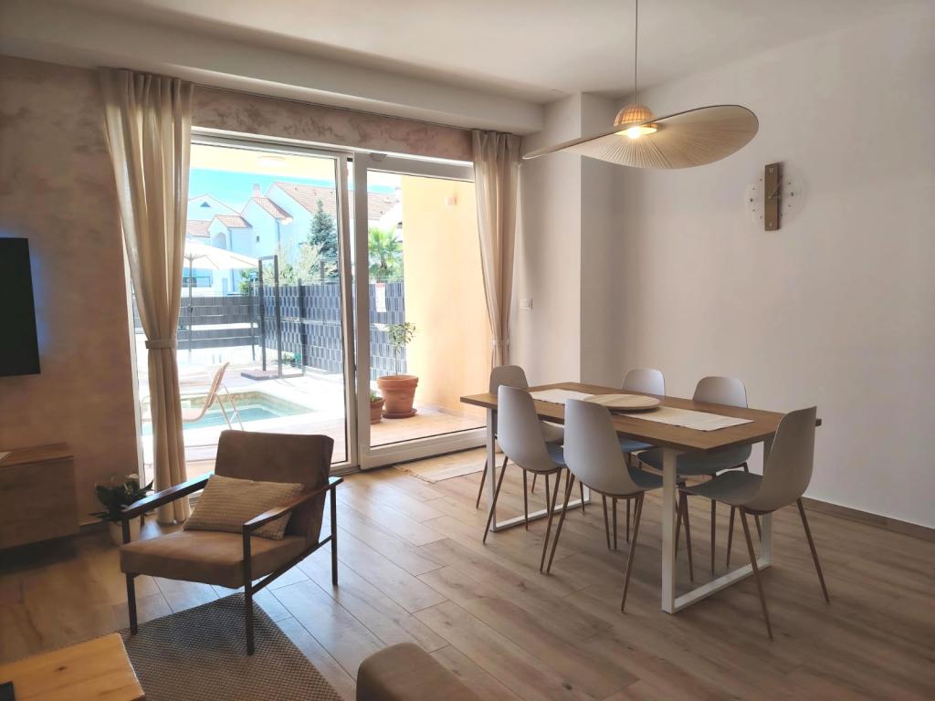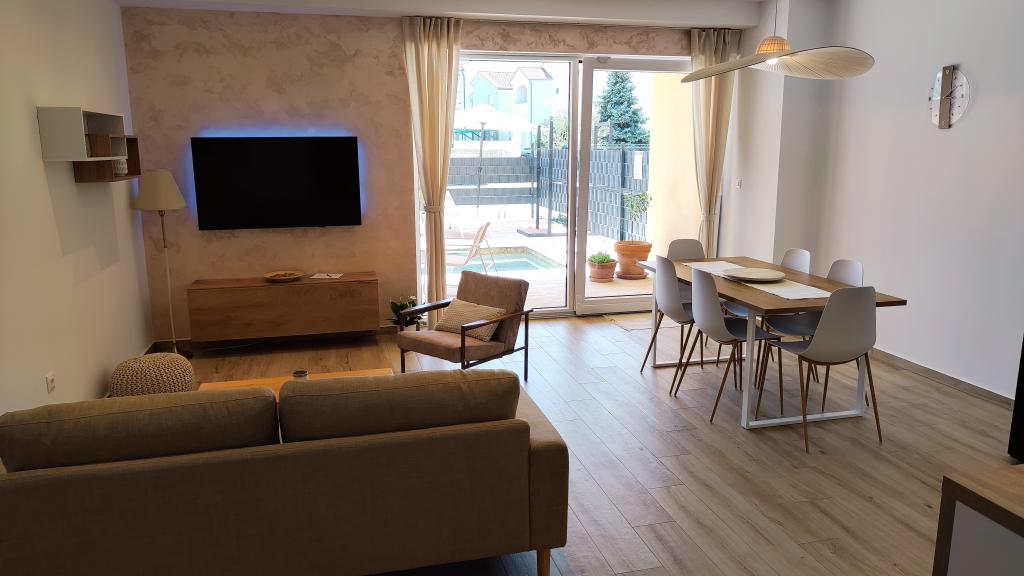 Maison de vacances neuve de deux étages avec piscine et deux logements indépendants (rez-de-chaussée et premier étage). Chaque logement mesure 95 m² et comprend trois chambres, une cuisine, une salle de bains, une terrasse et un salon. Un parking est disponible.