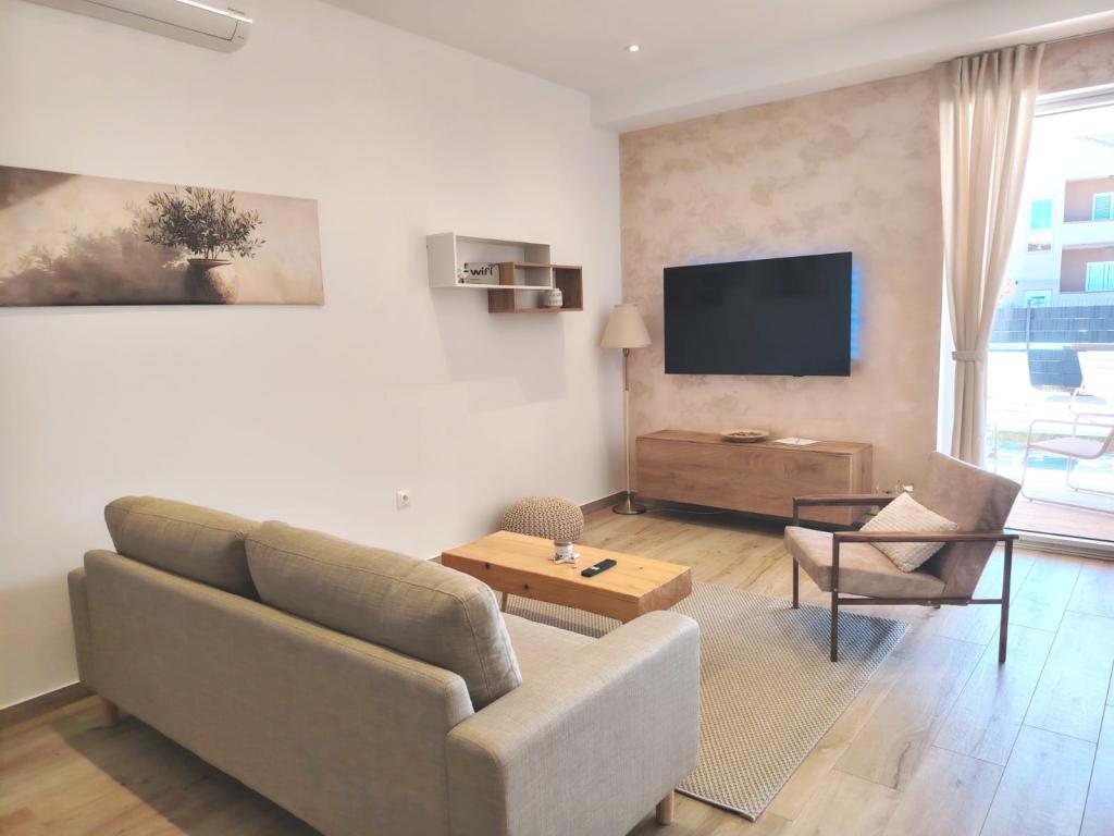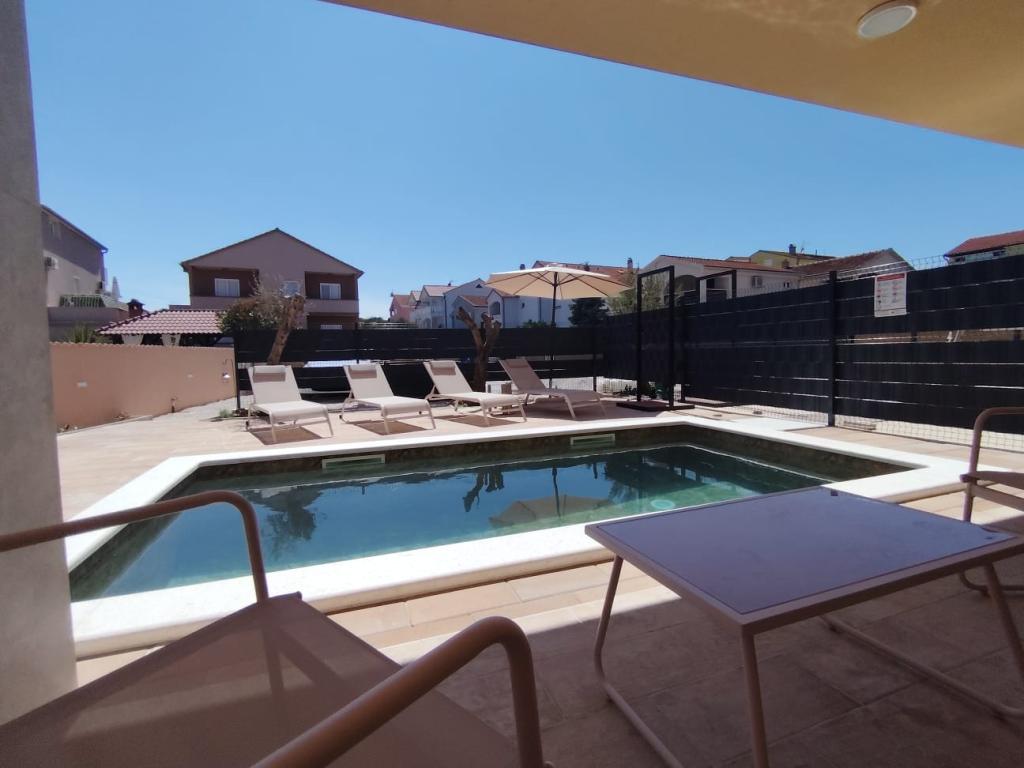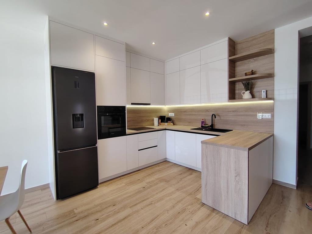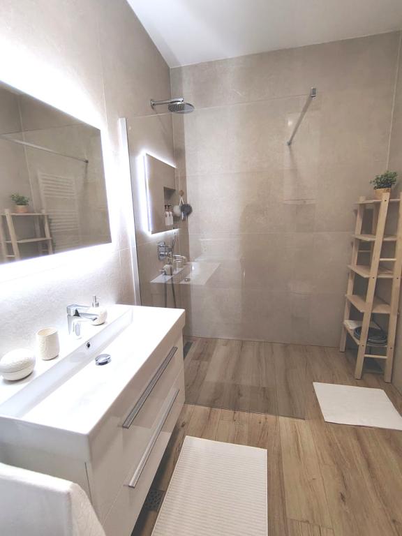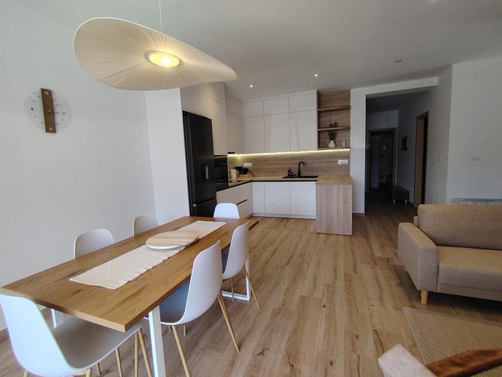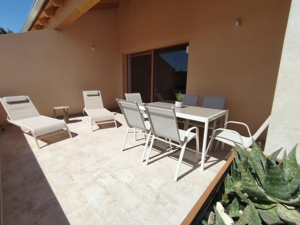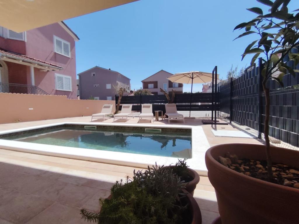 Maison de vacances neuve de deux étages avec piscine et deux logements indépendants (rez-de-chaussée et premier étage). Chaque logement mesure 95 m² et comprend trois chambres, une cuisine, une salle de bains, une terrasse et un salon. Un parking est disponible.