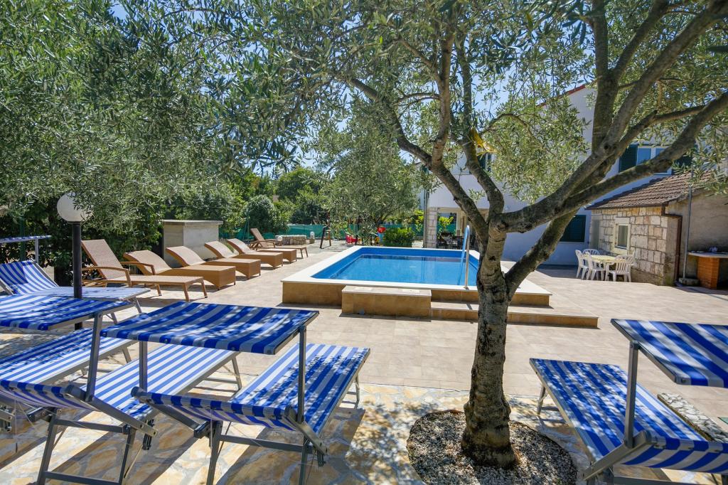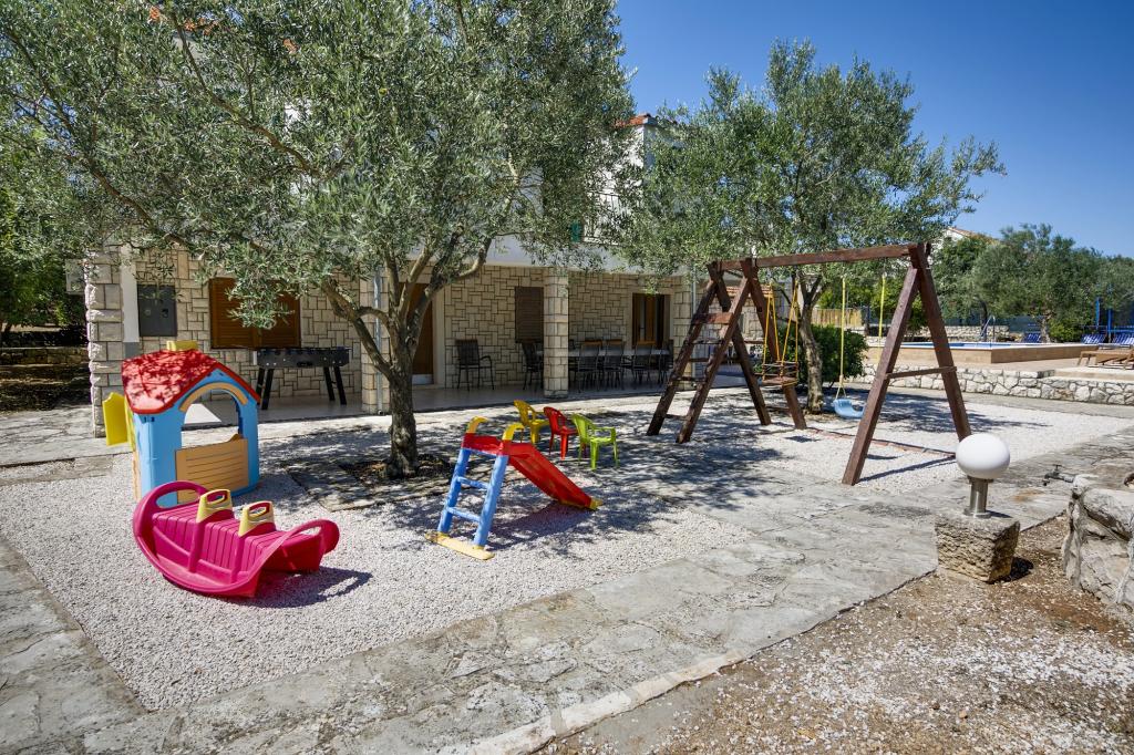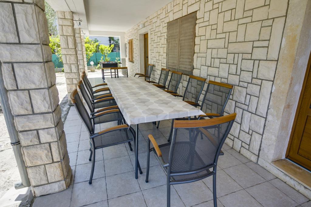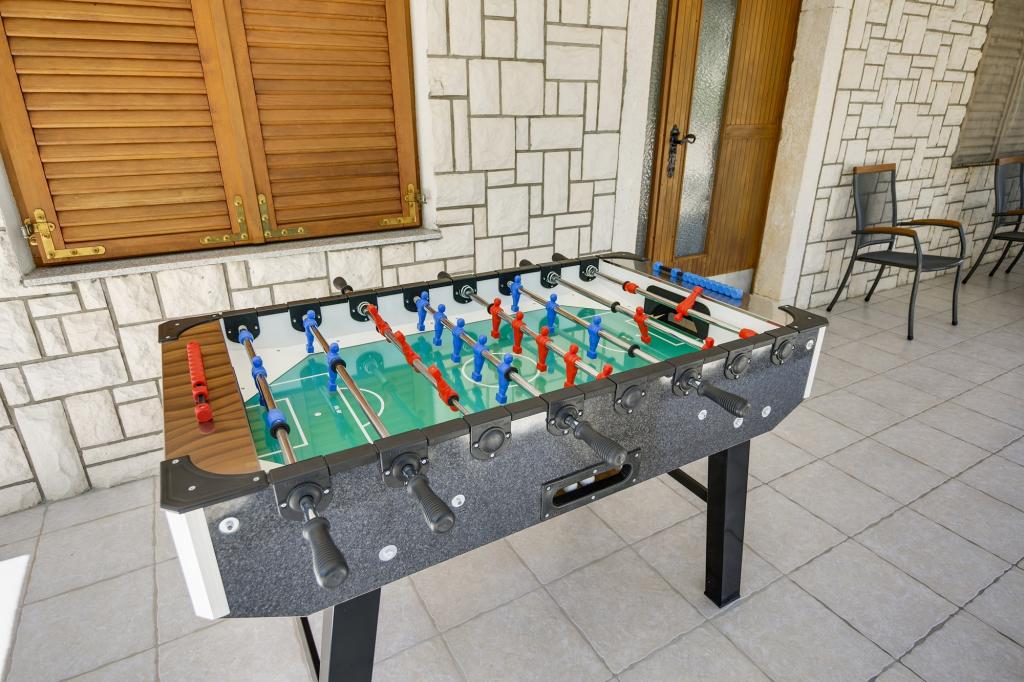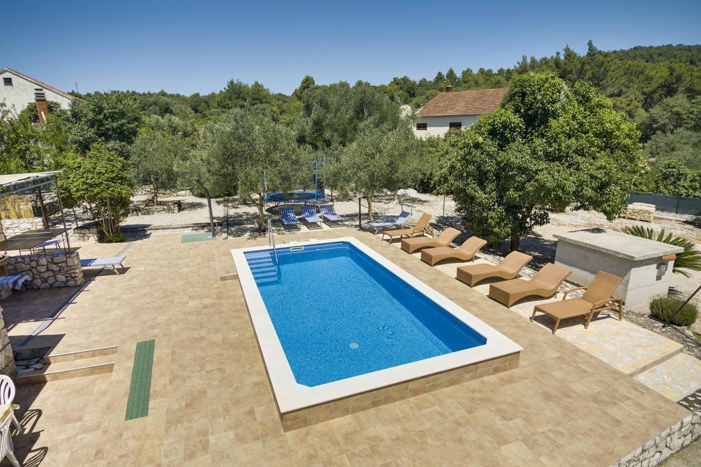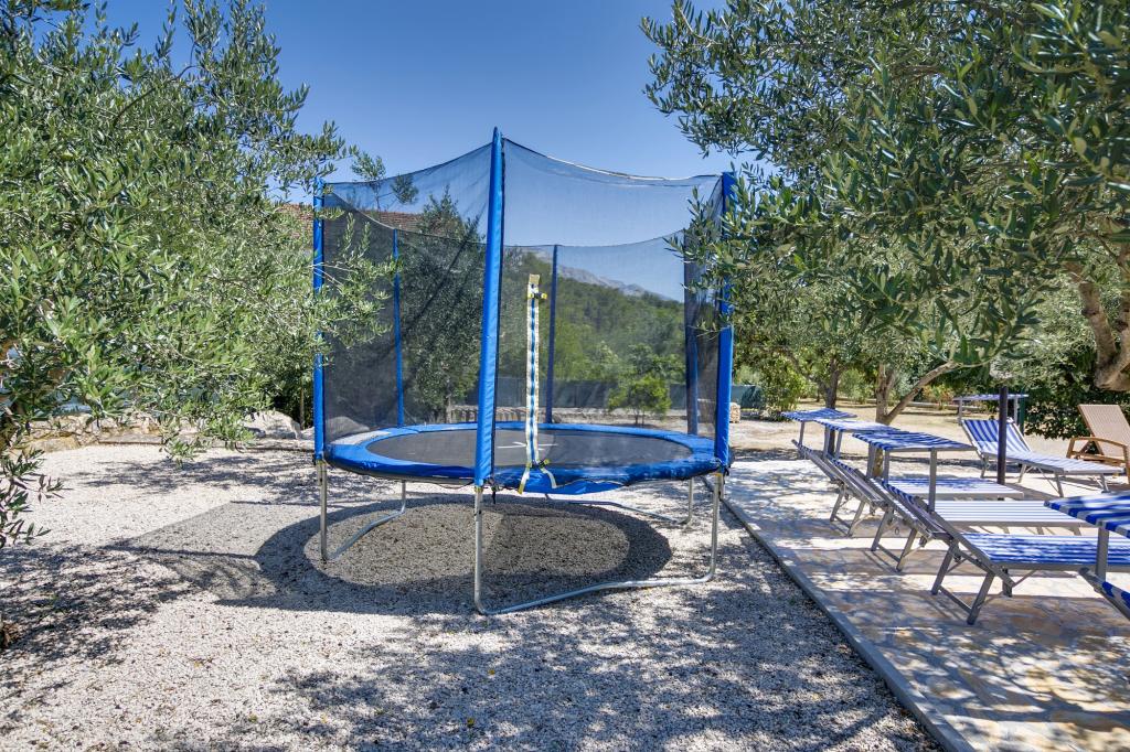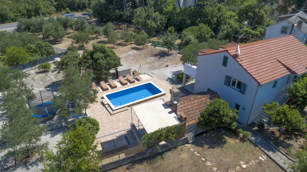 La Villa Ivanka est située dans la banlieue de la ville de Korčula sur un terrain spacieux de 3500m2. et offre un grand parking. Durant votre séjour, vous serez les seuls invités dans la maison, l'hôte n'est pas présent durant votre séjour. Le moyen le plus simple de se rendre à la plage, qui se trouve à 300 mètres, est à pied. Cette maison offre 193m2 d'espace pour un maximum de 10 plus 2 personnes. La maison se compose de deux appartements, l'un au premier étage avec quatre chambres et une cuisine, et l'autre au rez-de-chaussée avec une chambre, une salle de bain et une kitchenette. Chaque chambre est spacieuse, communicante avec une salle de bain, une terrasse et la climatisation. Devant la maison se trouve une piscine extérieure de 24 m2 avec une profondeur de 1,65 m, à côté de laquelle se trouvent 11 transats de qualité, une table de ping-pong, un baby-foot professionnel et un trampoline. À côté de la piscine, il y a une cuisine d'été pour la préparation des repas, à côté de la cuisine, il y a un grill extérieur pour une socialisation et une détente agréables. Il est permis d'amener un animal de compagnie dans l'unité d'hébergement. La ville de Korcula est à quelques minutes de marche agréable en bord de mer.