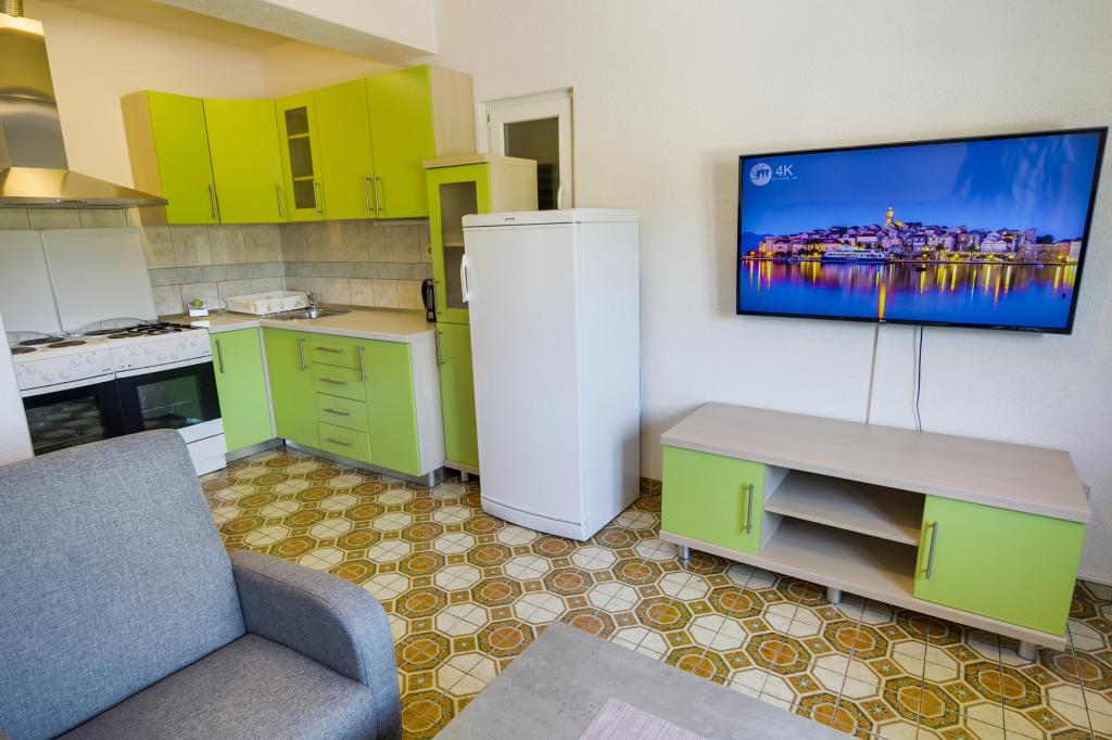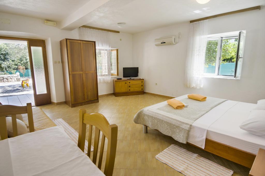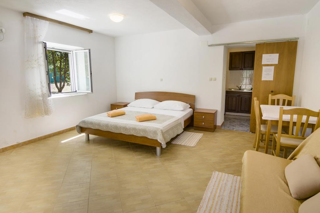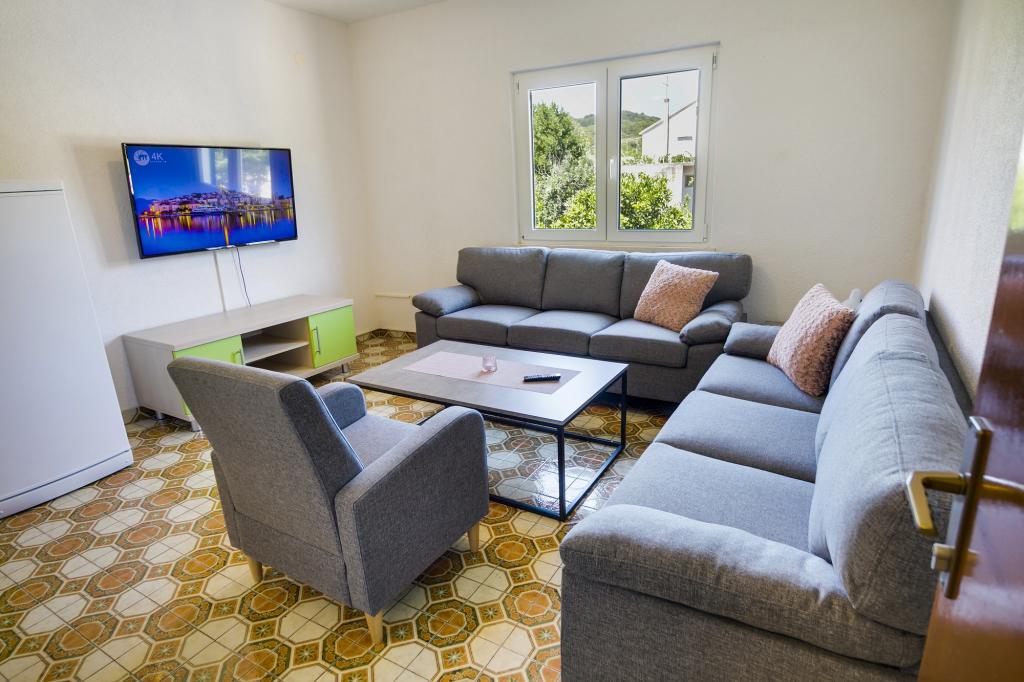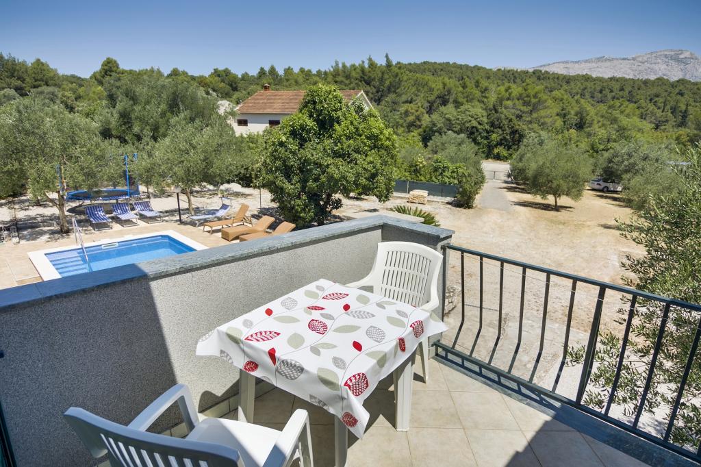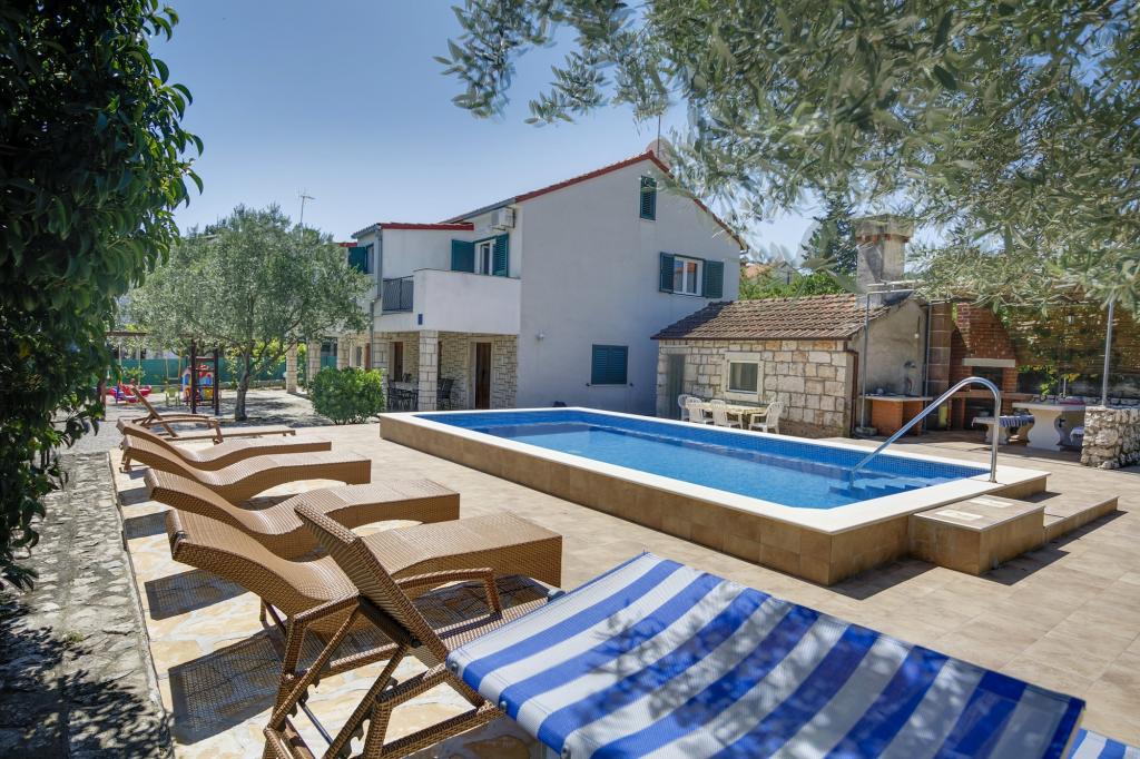 La Villa Ivanka est située dans la banlieue de la ville de Korčula sur un terrain spacieux de 3500m2. et offre un grand parking. Durant votre séjour, vous serez les seuls invités dans la maison, l'hôte n'est pas présent durant votre séjour. Le moyen le plus simple de se rendre à la plage, qui se trouve à 300 mètres, est à pied. Cette maison offre 193m2 d'espace pour un maximum de 10 plus 2 personnes. La maison se compose de deux appartements, l'un au premier étage avec quatre chambres et une cuisine, et l'autre au rez-de-chaussée avec une chambre, une salle de bain et une kitchenette. Chaque chambre est spacieuse, communicante avec une salle de bain, une terrasse et la climatisation. Devant la maison se trouve une piscine extérieure de 24 m2 avec une profondeur de 1,65 m, à côté de laquelle se trouvent 11 transats de qualité, une table de ping-pong, un baby-foot professionnel et un trampoline. À côté de la piscine, il y a une cuisine d'été pour la préparation des repas, à côté de la cuisine, il y a un grill extérieur pour une socialisation et une détente agréables. Il est permis d'amener un animal de compagnie dans l'unité d'hébergement. La ville de Korcula est à quelques minutes de marche agréable en bord de mer.