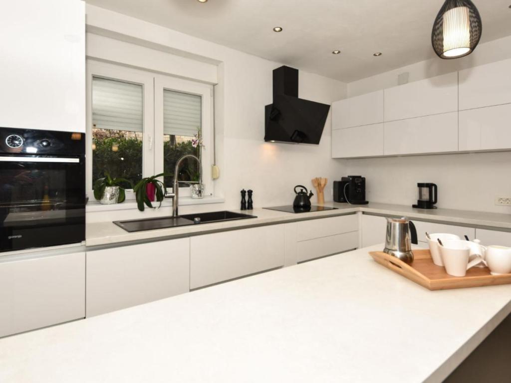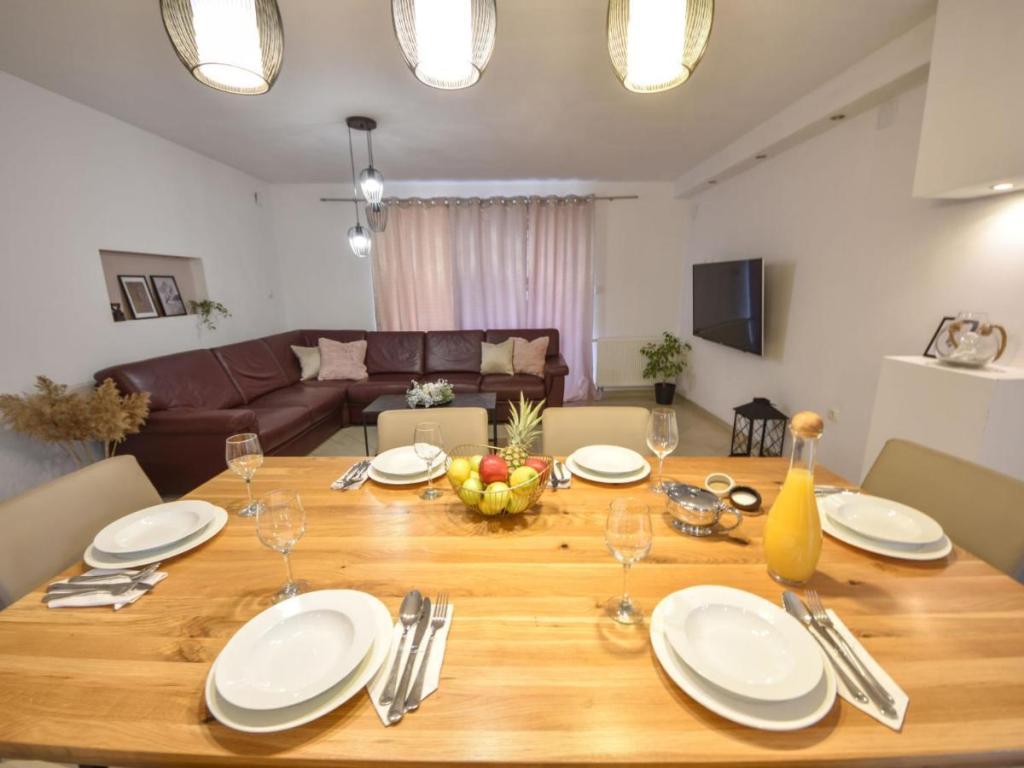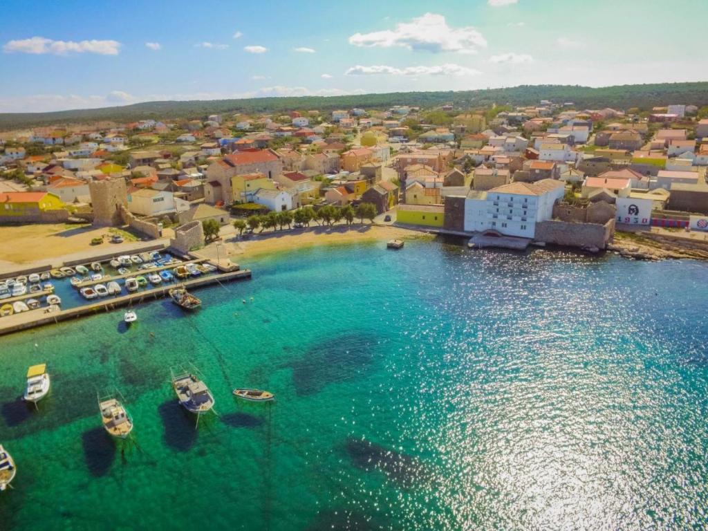 La maison individuelle « Villa Matino », sur deux étages, est située à 400 m du centre de Ražanac, dans un quartier calme et ensoleillé, et à 440 m de la mer et de la plage. Sur un terrain clôturé de 500 m², les hôtes bénéficient d'une piscine privée (8 x 4 m, profondeur 145 cm, ouverte du 15 mai au 15 octobre), d'une douche extérieure et d'un barbecue. L'entretien de la piscine est assuré par le propriétaire. La maison propose un accès internet gratuit, un lave-linge, quatre climatiseurs et un parking pour trois voitures. Les groupes de jeunes ne sont pas acceptés. La maison principale, d'une superficie de 250 m², se compose de deux appartements loués ensemble, une solution idéale pour les groupes souhaitant à la fois intimité et espace partagé. Le plus petit appartement comprend deux chambres (180 x 200 cm), une cuisine, une salle à manger, un salon, une salle de bains et trois terrasses (dont deux avec vue sur la mer). L'appartement le plus grand comprend 3 chambres (2 x 180 x 200 cm, 1 x 140 x 200 cm), une cuisine, une salle à manger, un salon, 2 salles de bains, 2 terrasses et un débarras.