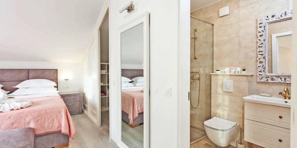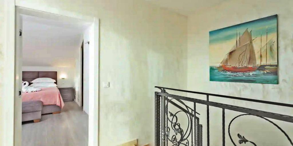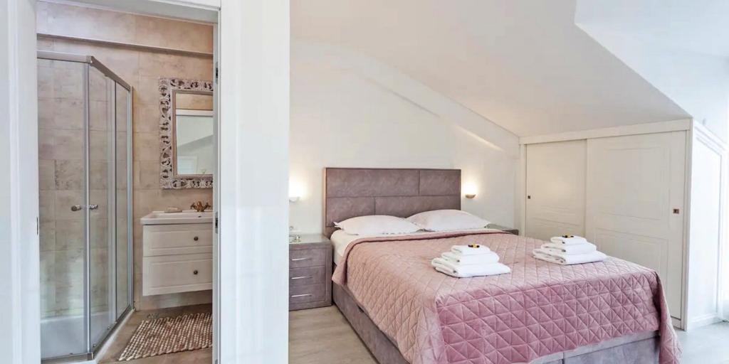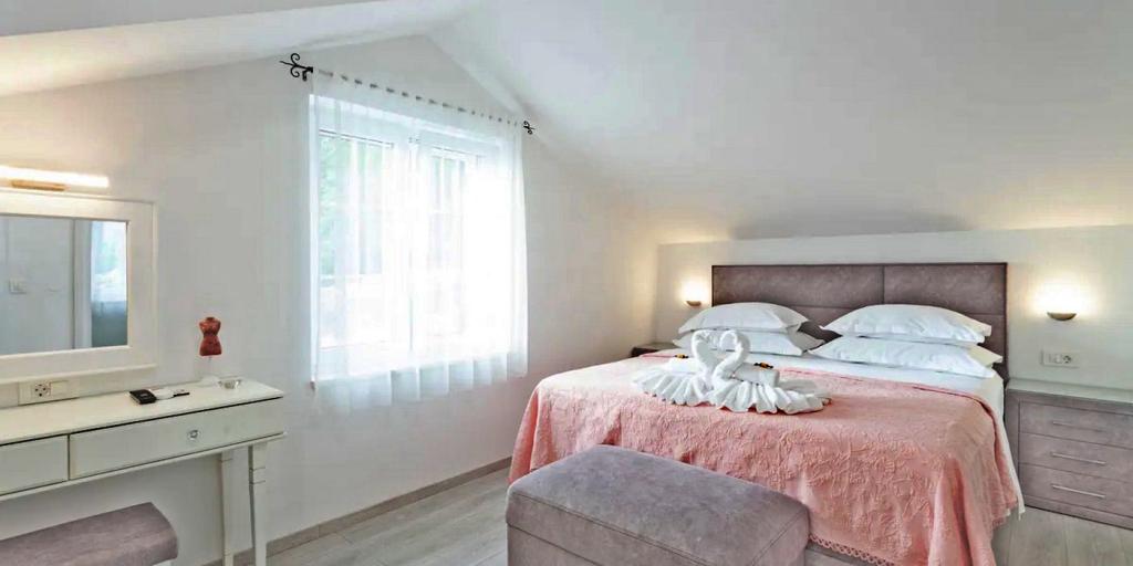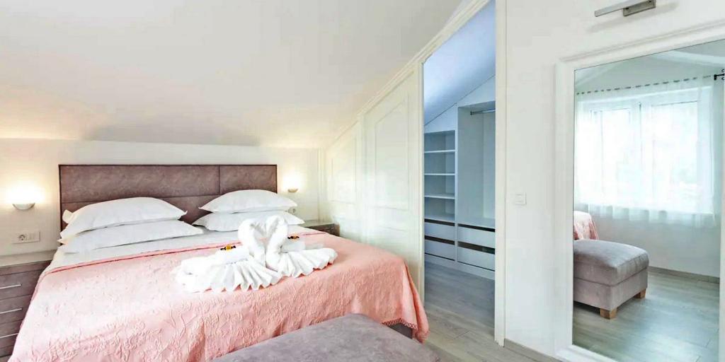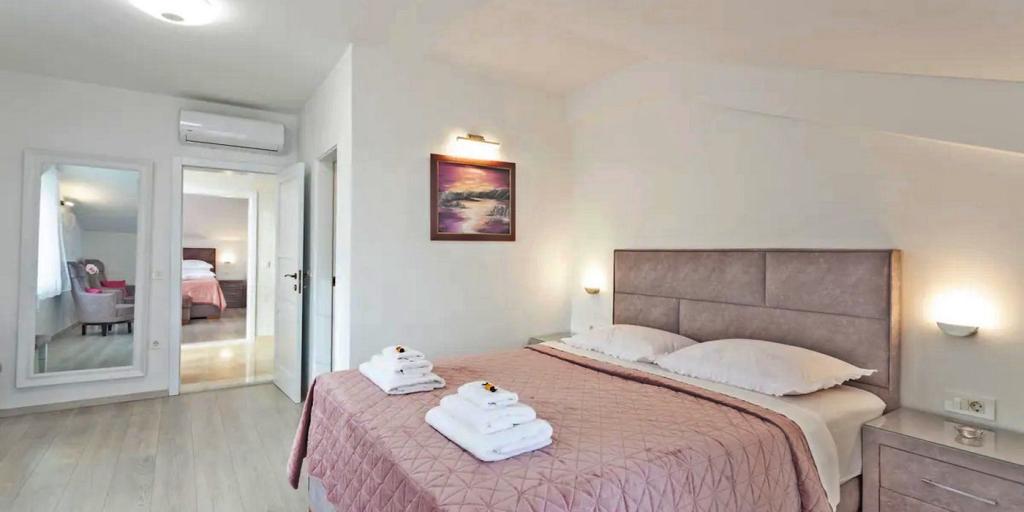 La maison se compose de deux chambres spacieuses avec salles de bain privées à l'intérieur de chaque chambre, pouvant accueillir 4 personnes, et si nécessaire, 1 lit d'appoint pour une personne peut être ajouté. Equipé de tout l'électronique nécessaire (lave-vaisselle, lave-linge, TV dans chaque chambre, wifi), d'une cuisine spacieuse, d'un salon, ainsi que d'un barbecue extérieur où vous pourrez préparer les plus belles gourmandises de poisson frais ou de viande pour vos proches. La maison dispose d'une piscine avec plage où vous pourrez vous amuser loin de l'agitation de la ville. Il y a également deux grandes terrasses avec des meubles d'assise sur deux étages, où la terrasse la plus haute offre une vue sur les îles et la mer, comme si vous les teniez dans la paume de votre main. La maison offre également 2 places de