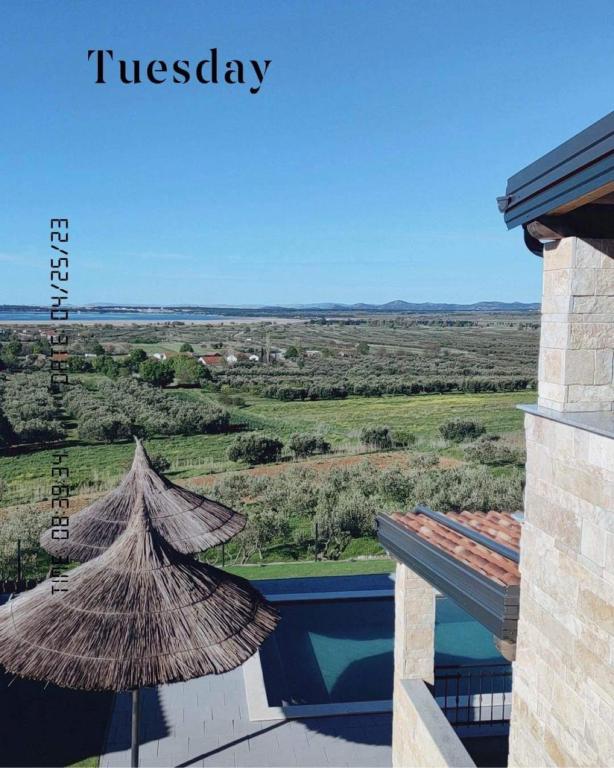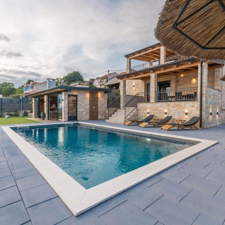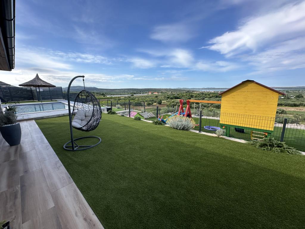 Nichée dans un cadre idyllique à proximité du parc naturel du lac de Vrana, la Villa La Vrana vous séduira par sa vue imprenable sur le lac et la mer. D'une superficie de 130 m², elle peut accueillir jusqu'à 8 personnes dans 3 chambres à la décoration moderne. Au premier étage, vous trouverez 2 chambres et une salle de bains avec baignoire. Au rez-de-chaussée, un salon élégamment décoré offre une vue magnifique sur les environs, ainsi qu'une cuisine moderne et entièrement équipée avec coin repas. Le salon est doté d'un canapé-lit pouvant accueillir 2 personnes supplémentaires. On y trouve également une chambre avec un lit double et une salle de bains avec douche. Dans la cour de la villa, une piscine de 8 x 4 m est chauffée en basse et basse saison. Transats et serviettes de piscine sont à votre disposition. Un parking gratuit, une borne de recharge pour véhicules électriques et une grande aire de jeux pour enfants sont également disponibles sur place. À côté de la villa, vous pourrez vous détendre et préparer de délicieux repas dans la cuisine d'été entièrement équipée d'un barbecue.