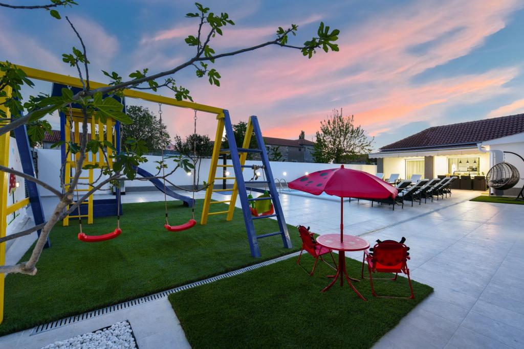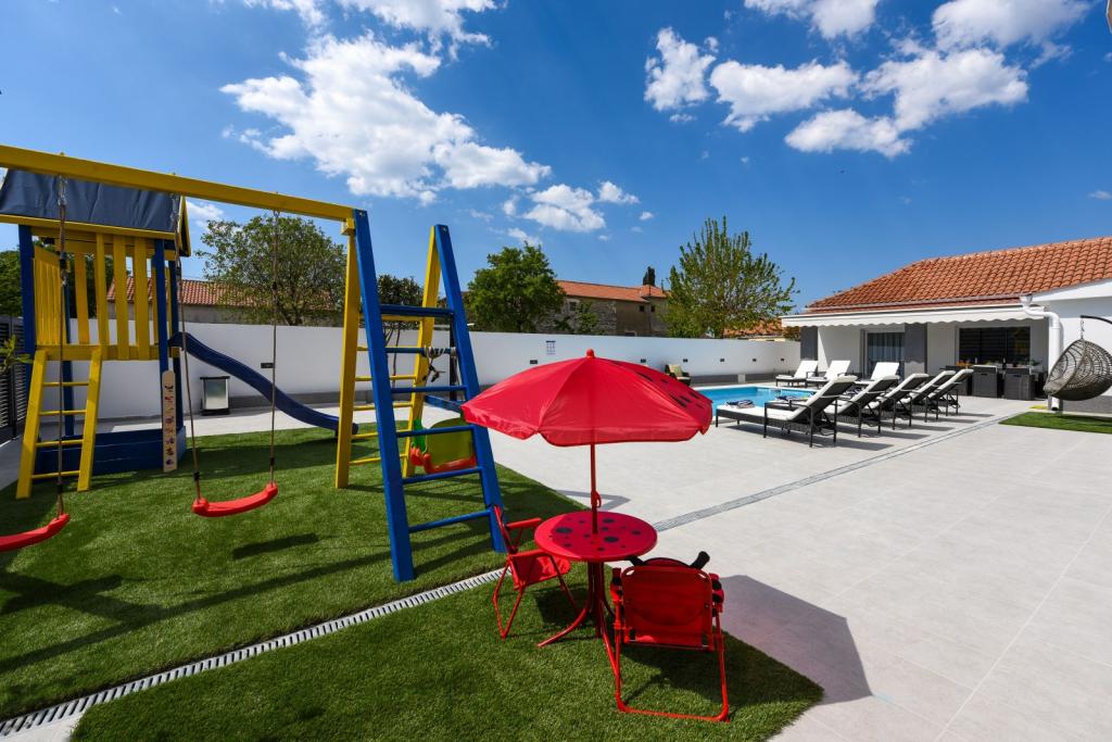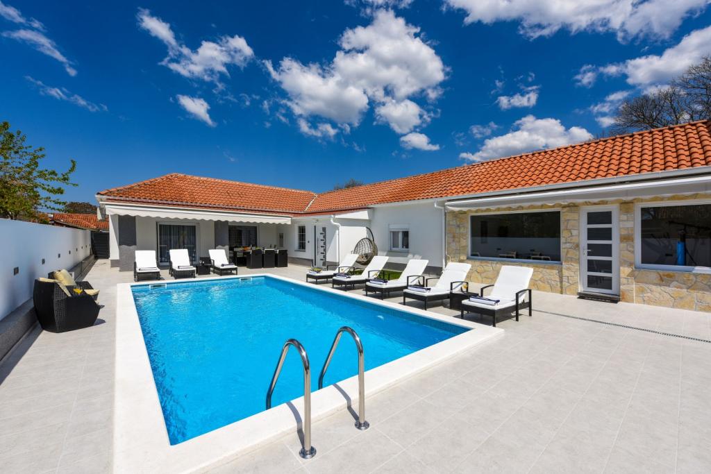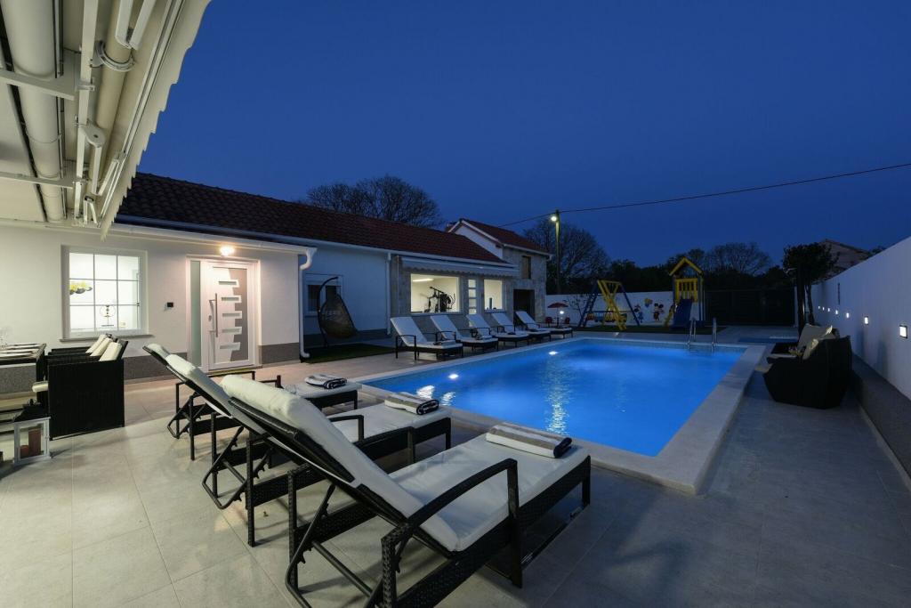 Villa privée Mare avec piscine chauffée. Située entre Zadar (2 km) et l'aéroport (5 km), la Villa Mare est une maison de vacances récemment rénovée et entièrement meublée. Elle dispose d'une piscine privée chauffée, de trois chambres (dont deux peuvent être converties en lit gigogne), d'un salon avec télévision à écran plat (139 cm), d'une cuisine entièrement équipée avec coin repas, de deux salles de bains, d'une salle de réception (billard, fléchettes, PlayStation) et d'un espace fitness avec télévision à écran plat (139 cm). Toutes les pièces sont climatisées. La villa dispose également d'une cuisine d'été avec barbecue intérieur. La villa est également louée entre 1,10 et 1,40 € par mois, pour une durée minimale d'un mois.